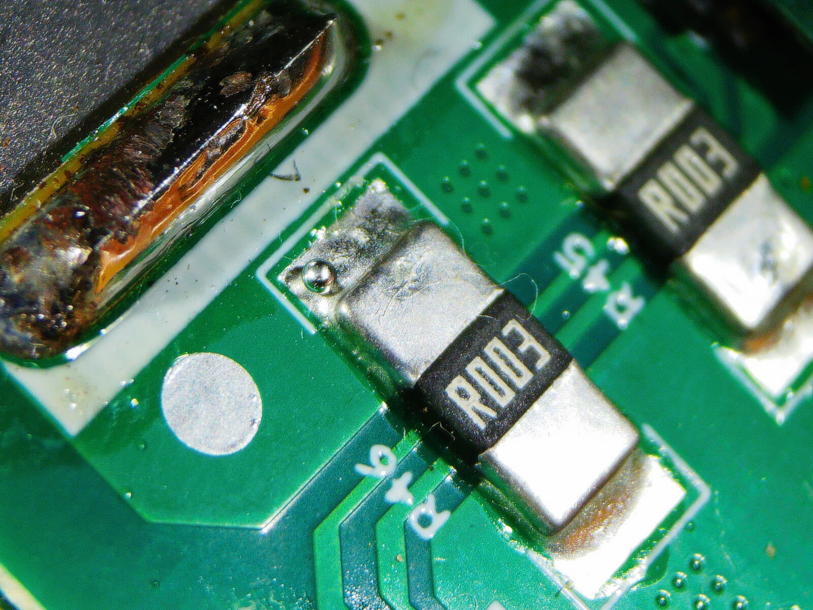 このはんだボールはICのリード線ピッチより大きいサイズであるため、振動や衝撃でボールが動いて運悪くプロテクトICやFETスイッチの制御端子に接触してしまった場合、保護動作が無効化されてしまう可能性があるため、基板の製造品質には若干難があると考えられます。