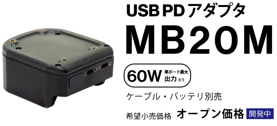 MB20Mは、電動工具バッテリに装着して使用するUSB Type-Cを2口備えるUSB PDアダプタです。