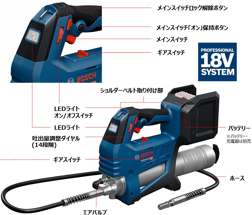 ボッシュでもバッテリー式グリスガンが登場、製品仕様は各社横並び