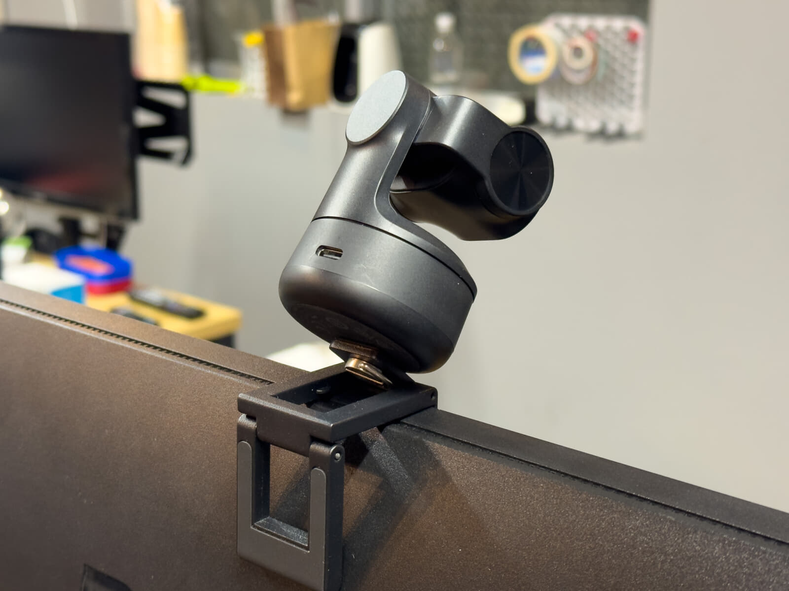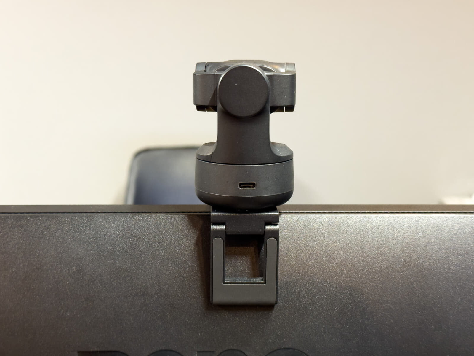 モニター上部に設置したEMEET PIXYの背面です。クリップ式のマウントでベゼルの薄いディスプレイにも安定して固定でき、角度調整用のヒンジを調節できる機能がありましたコンパクトに収まっています。背面中央にはUSB-C端子が配置されています。