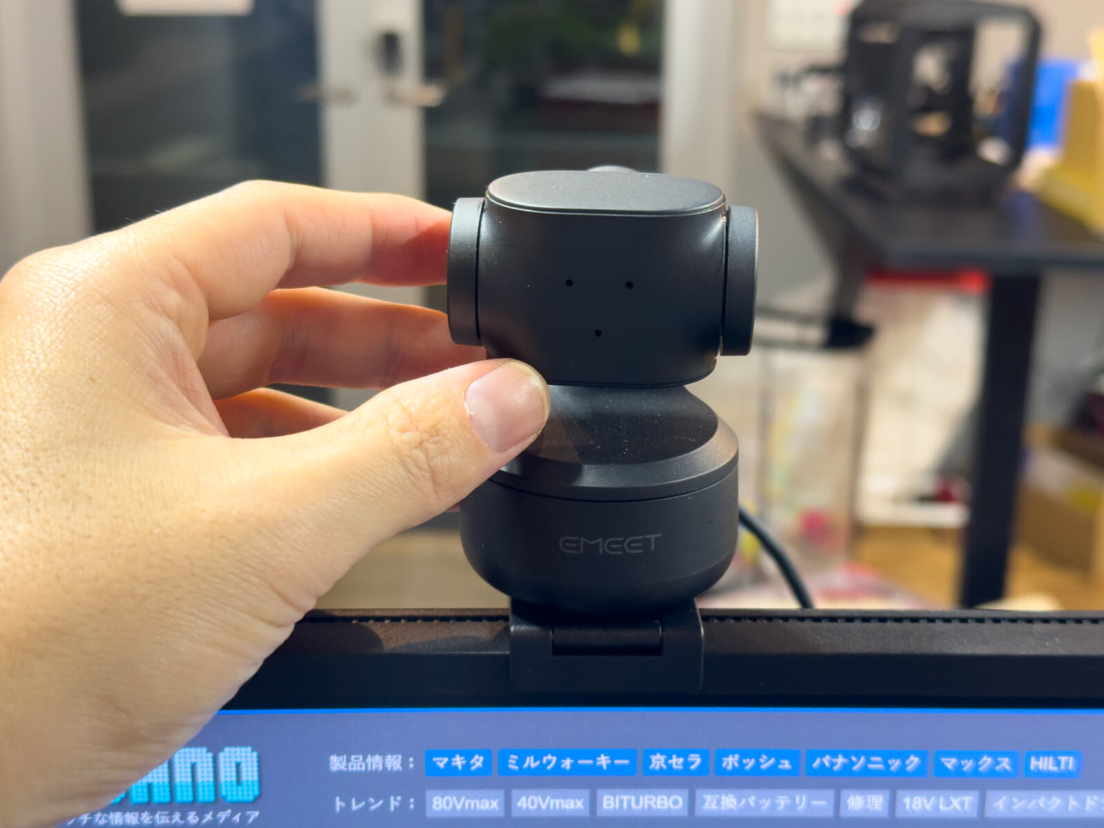 モニター上に載せたEMEET PIXYを斜め後ろから見て、台座部分はヒンジを前後に大きくチルトした状態です。ディスプレイサイズに合わせて角度を調整しつつ、設置スタイルも細かく追い込めます。