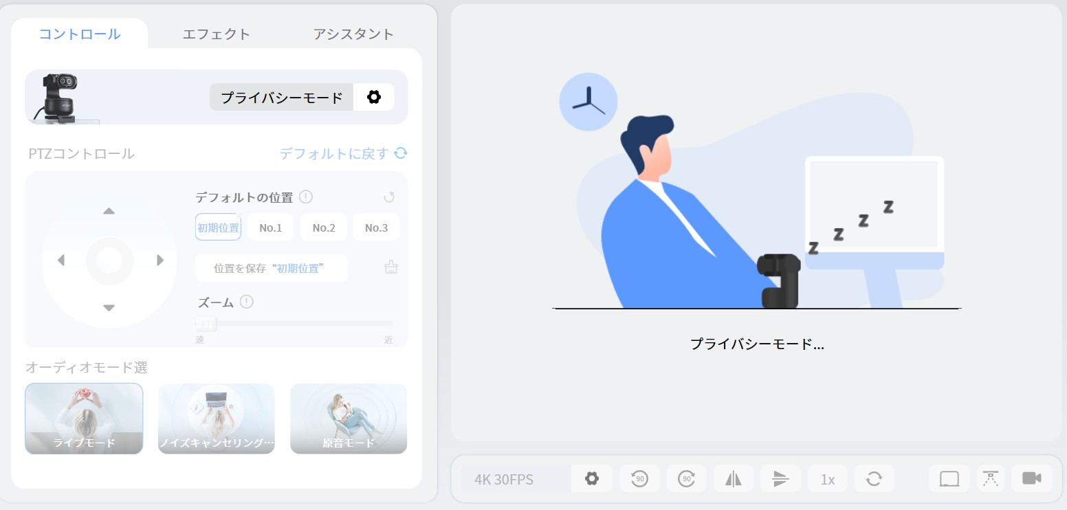 EMEET PIXYのコントロールソフト EMEET STUDIO上でもプライバシーモードに設定できる。ソフト上でプライバシーモードをONにした場合は、自動的にカメラが下を向いてくれる。