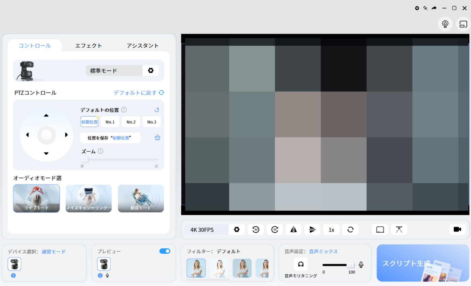 コントロールでは、カメラ位置や搭載マイクのノイズキャンセリングの調整などができます。PTZコントロールでカメラの向きやズームを調整し、よく使う構図を「初期位置」やNo.1~No.3として登録してワンタッチで呼び出せます。