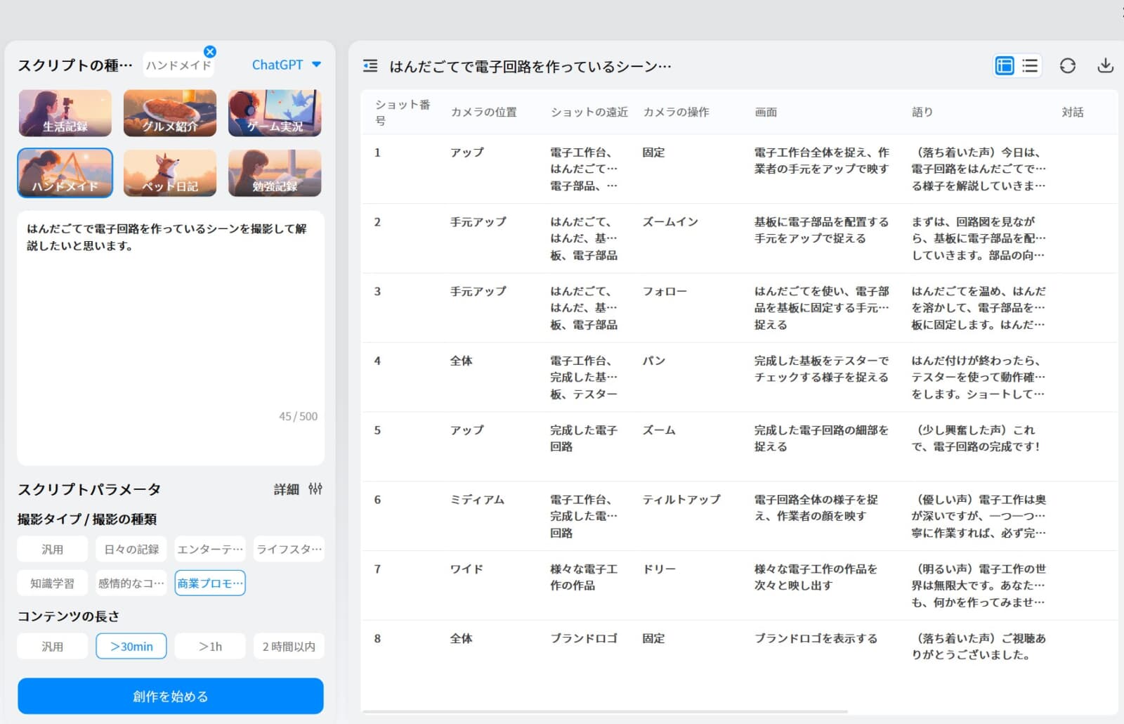 このスクリプト生成機能は、動画の台本とカメラワークを自動で組み立ててくれるツールです。