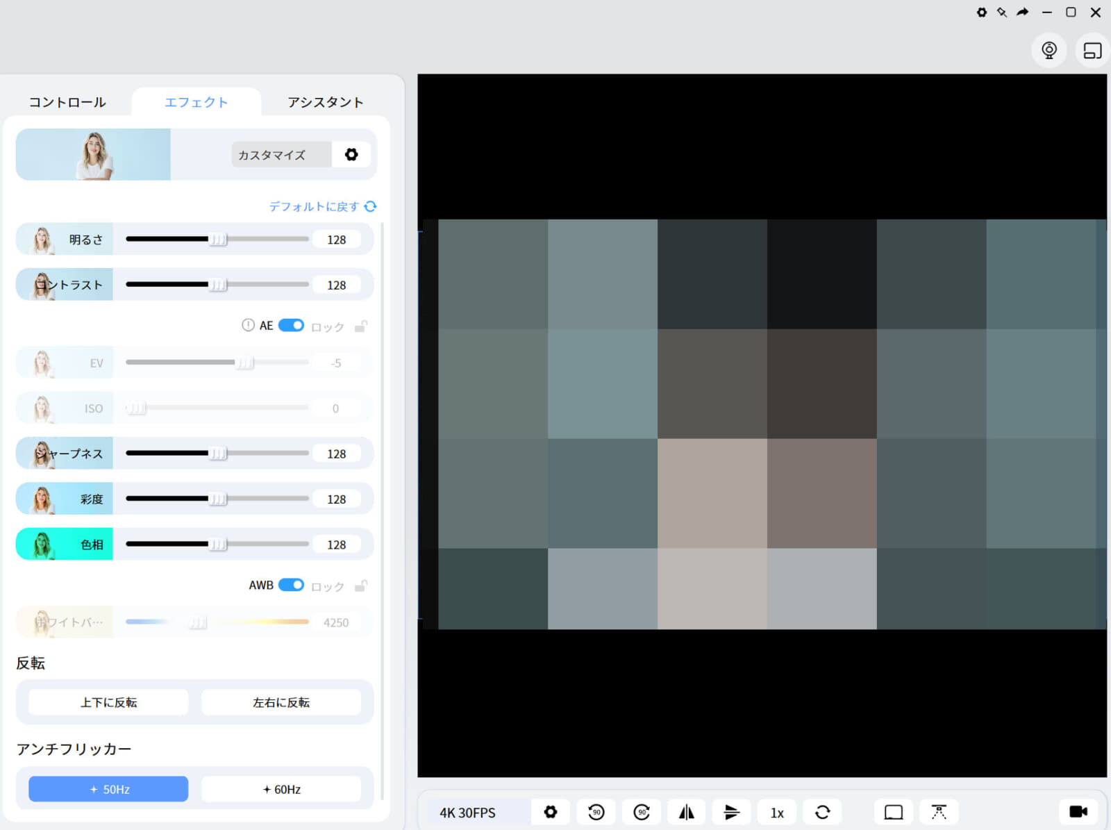 明るさ・コントラスト・シャープネス・彩度・色相といった基本パラメータに加え、EV補正やISO、ホワイトバランスも個別に調整できるため、室内照明や日中・夜間など環境に合わせた設定ができます。上下/左右反転や照明の50Hz・60Hzのアンチフリッカー設定もここから行えるので、蛍光灯のチラつき対策やミラー表示のオン/オフもワンクリックで切り替えられます。