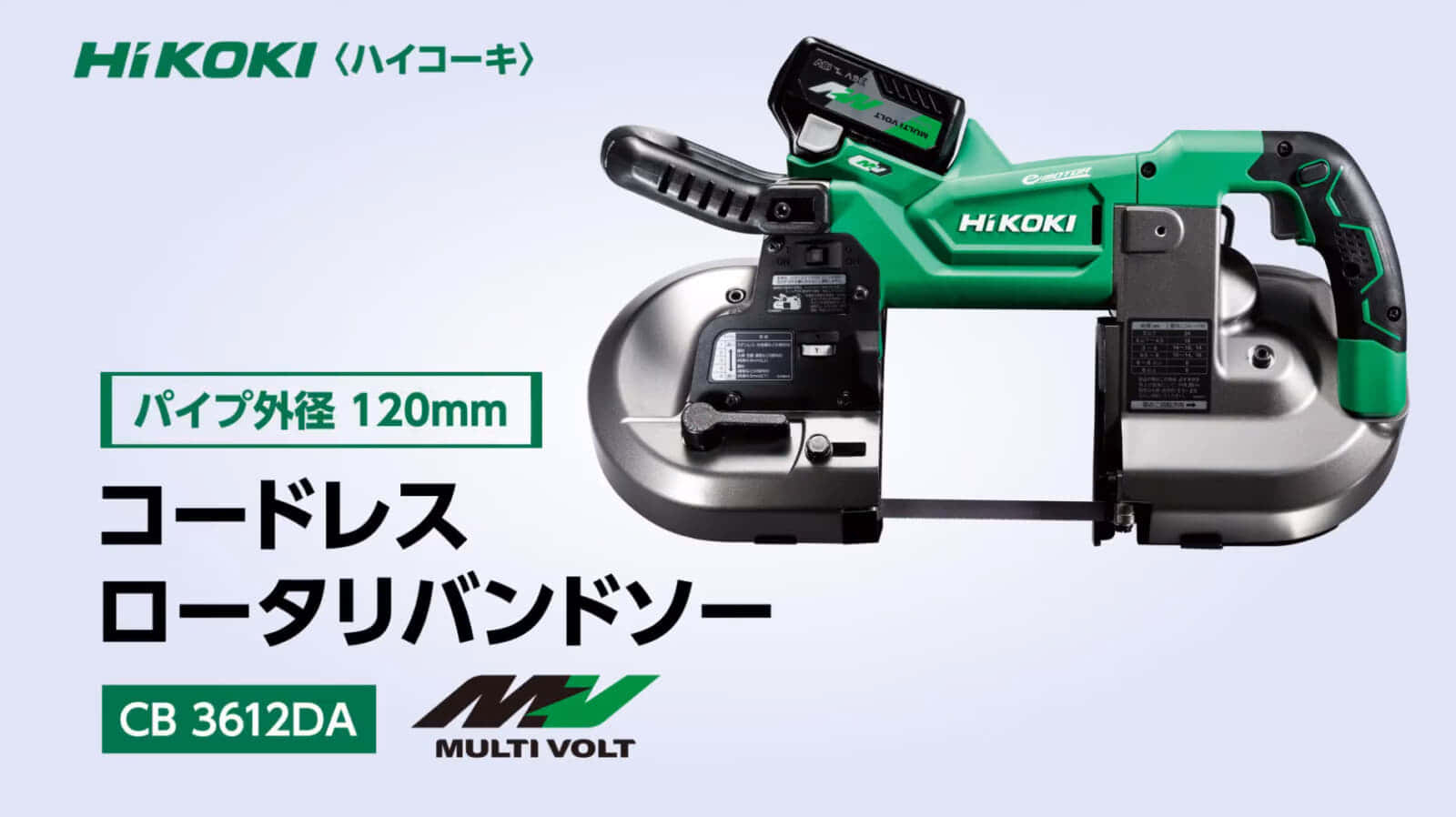 電動工具ブランドHiKOKIを展開する工機ホールディングス株式会社は、2020年9月にマルチボルト36Vバッテリーに対応するコードレスバンドソー CB3612DAの発売します。高電圧のマルチボルトバッテリーと3段ギア減速機構によって、バッテリー搭載モデルながら切断スピードが向上し、電源コード式従来機比較で約6倍のスピードを実現。