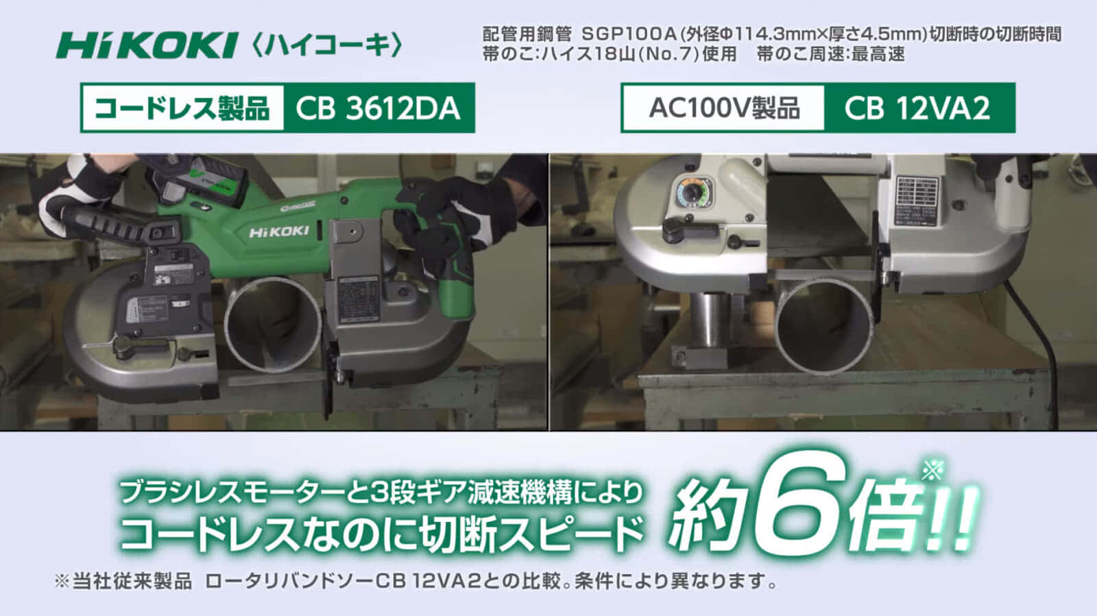 今回のCB3612DAは、日立工機が過去に販売していた電源コード式バンドソー CB12VA2のバッテリーモデルですが、実際の性能が大きく向上した意欲作になっているのが特徴です。特に切断スピード6倍は驚異的な性能向上です。