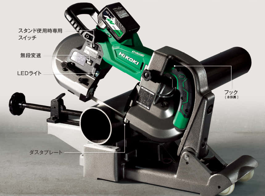 CB3612DAでは、充電式バンドソーとして珍しいスタンド装着にも対応しています。別売りのバンドソー用スタンドCB12-ST2に装着すれば、ET36Aと合わせて使えば定置型バンドソーとしても使えるので、工場設備としての運用も可能です。