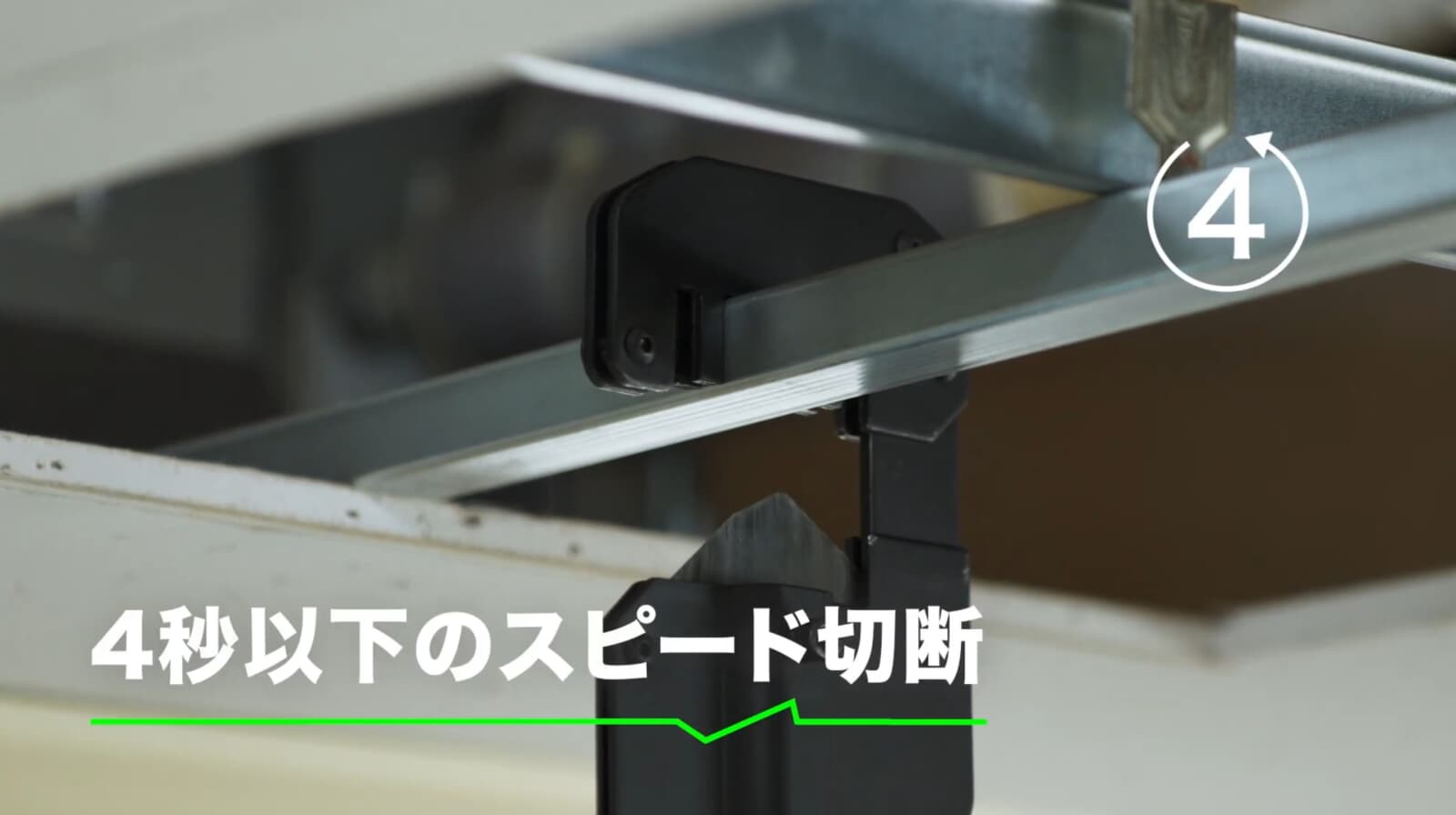 1作業辺りの切断作業は4秒以下で、電動モデルながら電池込み重量2.5kgのボディで取り回しにも優れています。刃先は360度回転する仕様で切断作業時の自由度も高く、LEDライト搭載で天井裏など暗い場所での作業にも対応します。