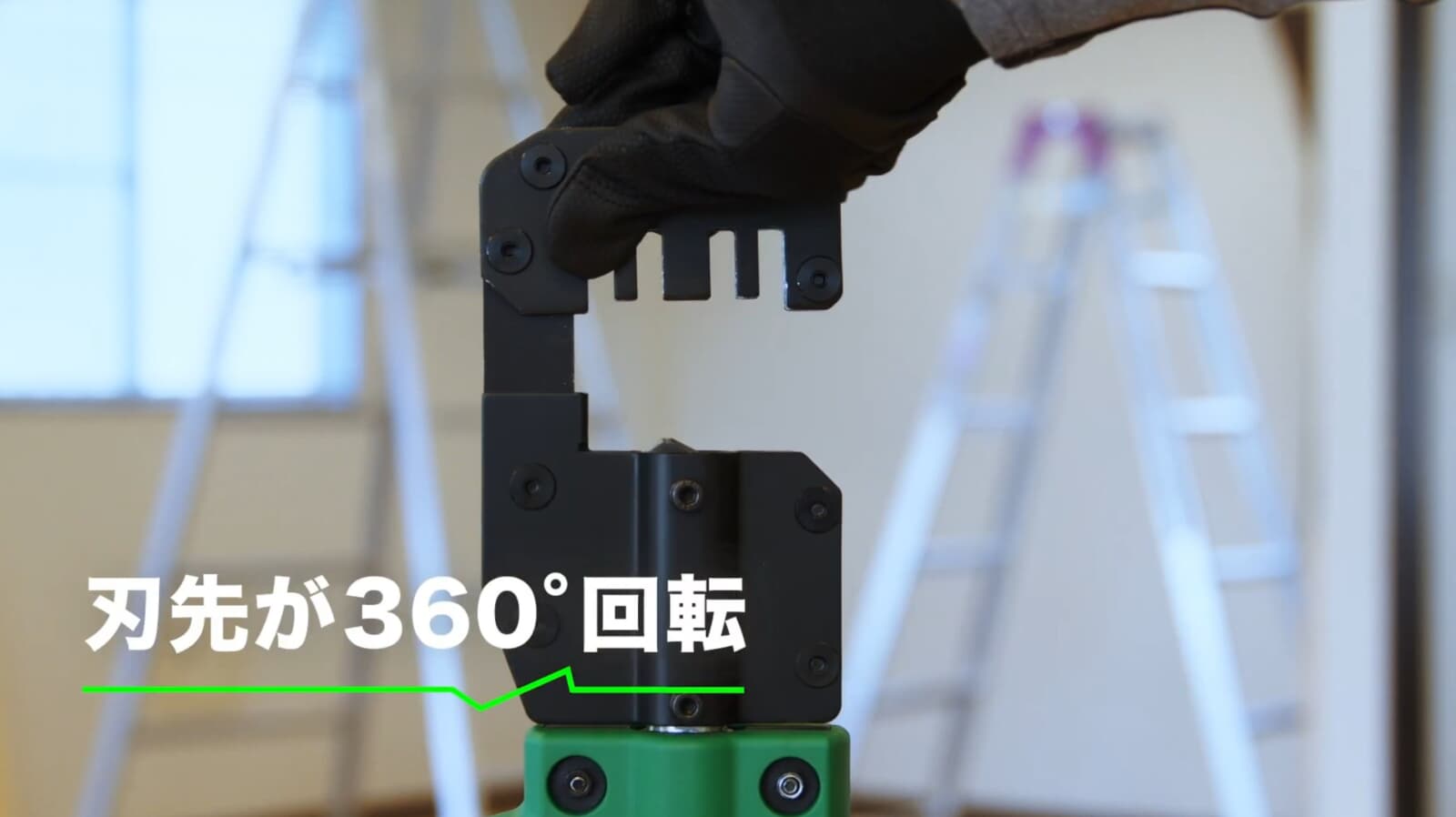 高所で体勢を気にせず作業が行えるよう、刃先が360°回転します。
