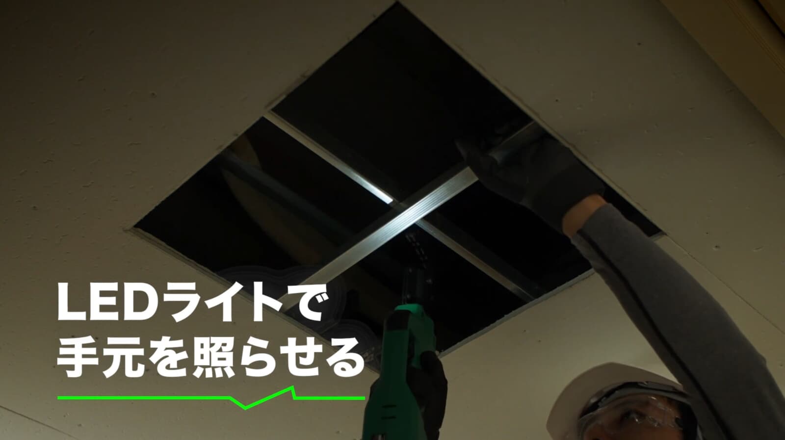 天井裏など暗い場所での作業に便利なLEDライト付。細部の確認などに役立ちます。