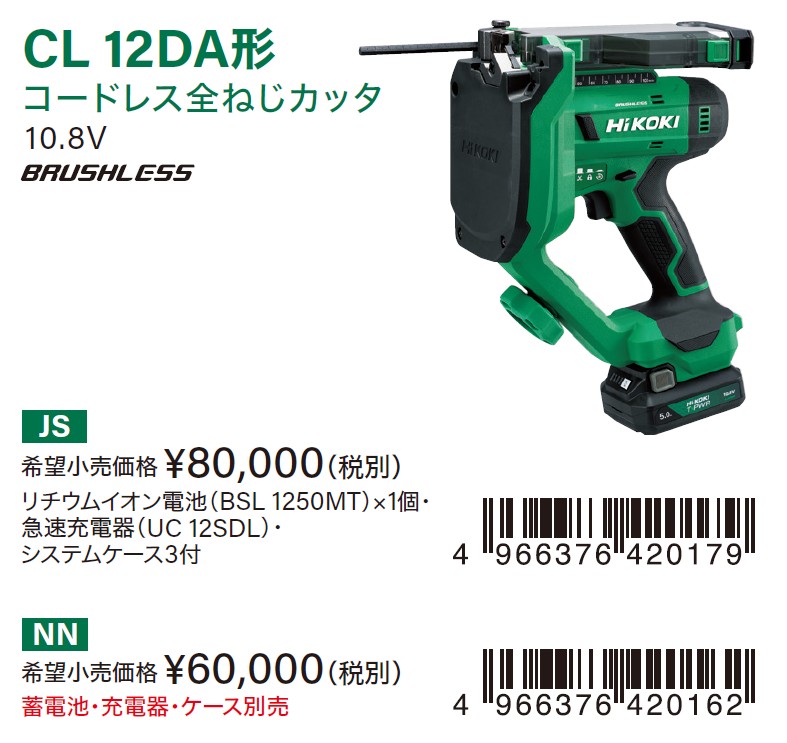 販売仕様は、リチウムイオン蓄電池と充電器・システムケース3が付属するCL12DA(JS)仕様と本体のみのCL12DA(NN)仕様で販売します。
