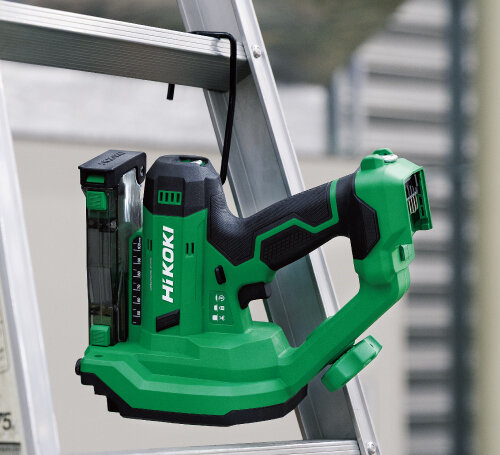 仮置きに便利なフック付き。脚立やレールにかけることで高所作業での作業性を実現します。