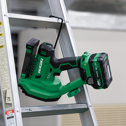 仮置きに便利なフック付き。脚立やレールにかけることで高所作業での作業性を実現します。