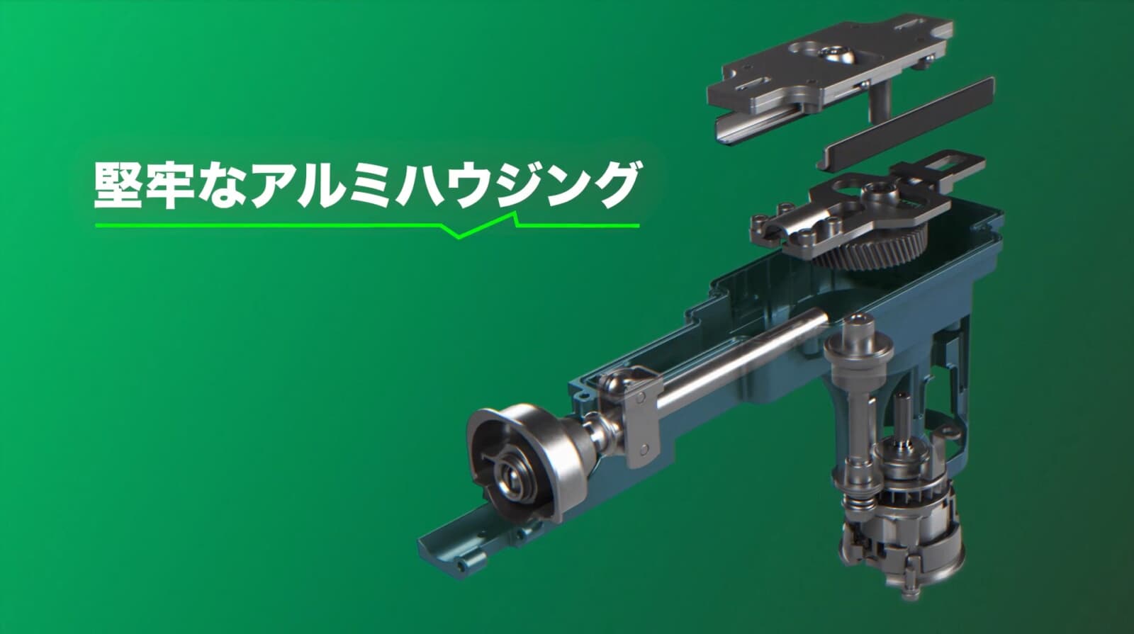 リニアガイド式カウンタウェイト・ローラーサポート構造はそのままに、新たな電池の防振構造とギヤ耐久性向上のための新構造採用によって、高耐久と低振動を両立しているのが特徴です。