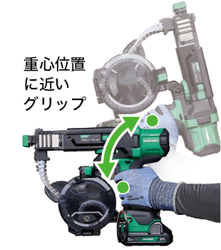 質量2.1kgの軽量設計に加え、重心が手に近く、手首の疲労を軽減できる設計構造で天井作業などにも快適な重心バランスを実現しています。