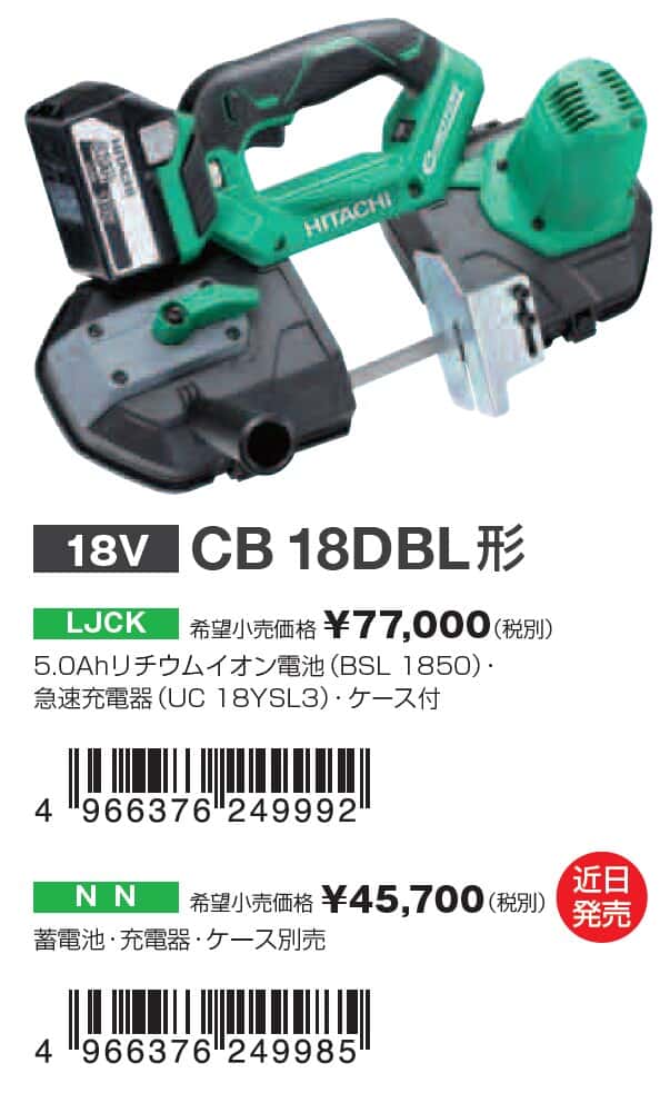 販売仕様は、バッテリー・充電器・ケースが付属する(LJCK)、CB18DBL本体のみ(NN)で展開します。