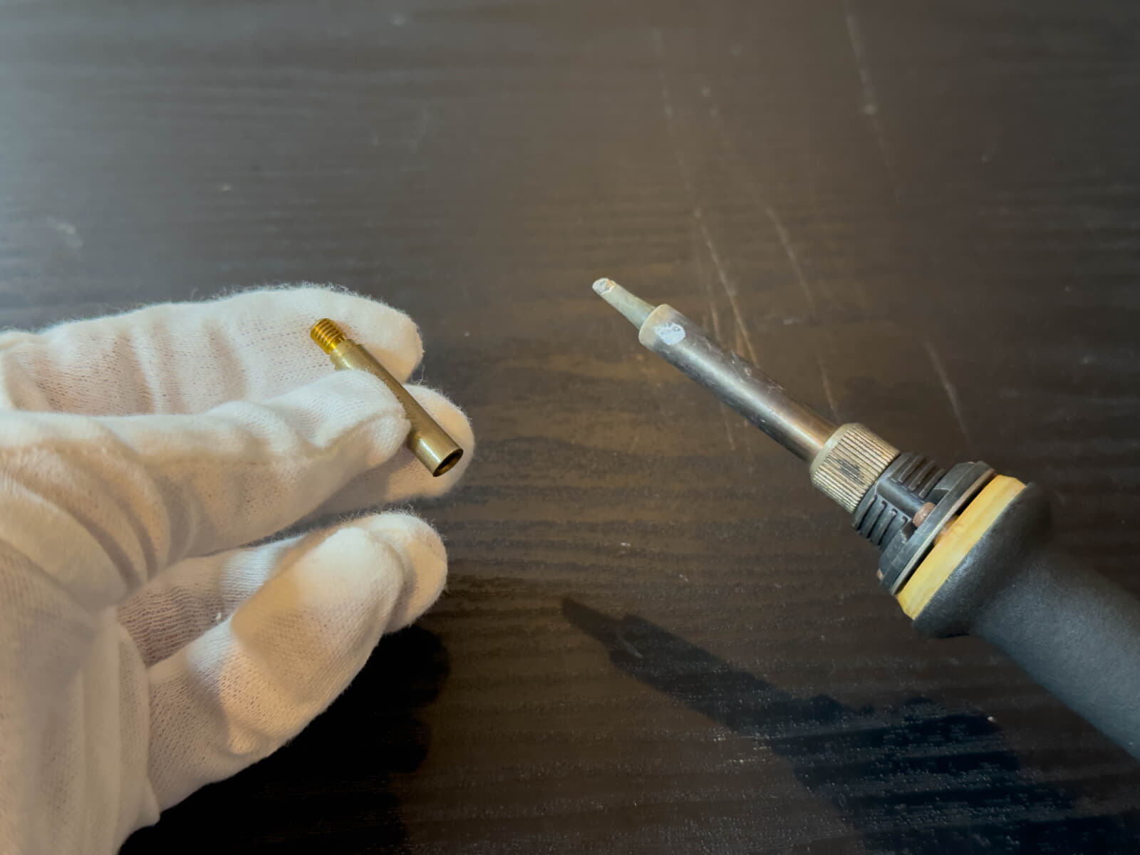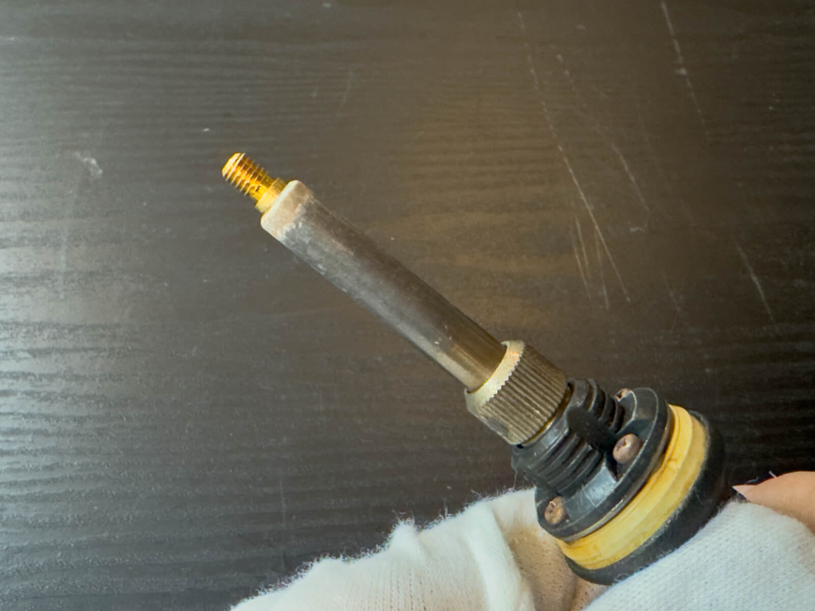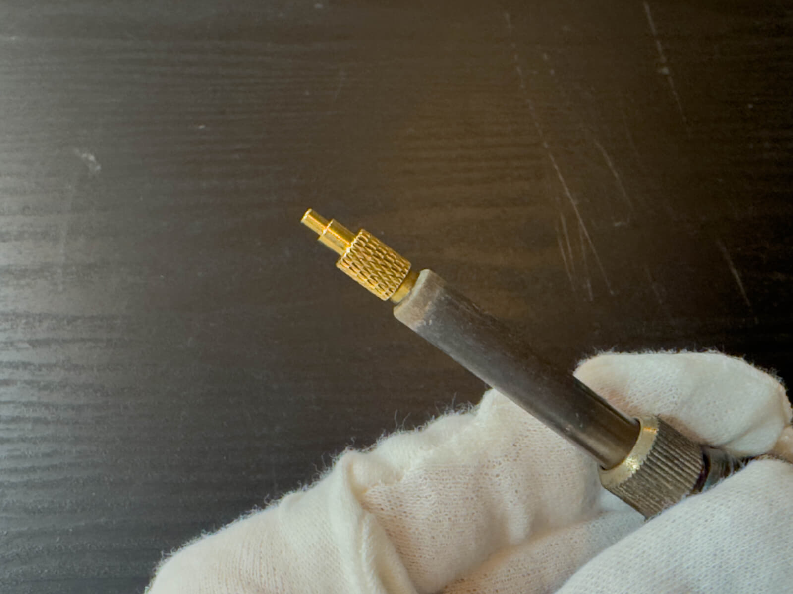 インサートチップを装着したら、普通のコテ先の交換と同じように保護パイプで固定します。保護パイプがしっかり固定されていないと、チップ先端を装着する時に空回りしてしまうので、少し強めに締めておきます。