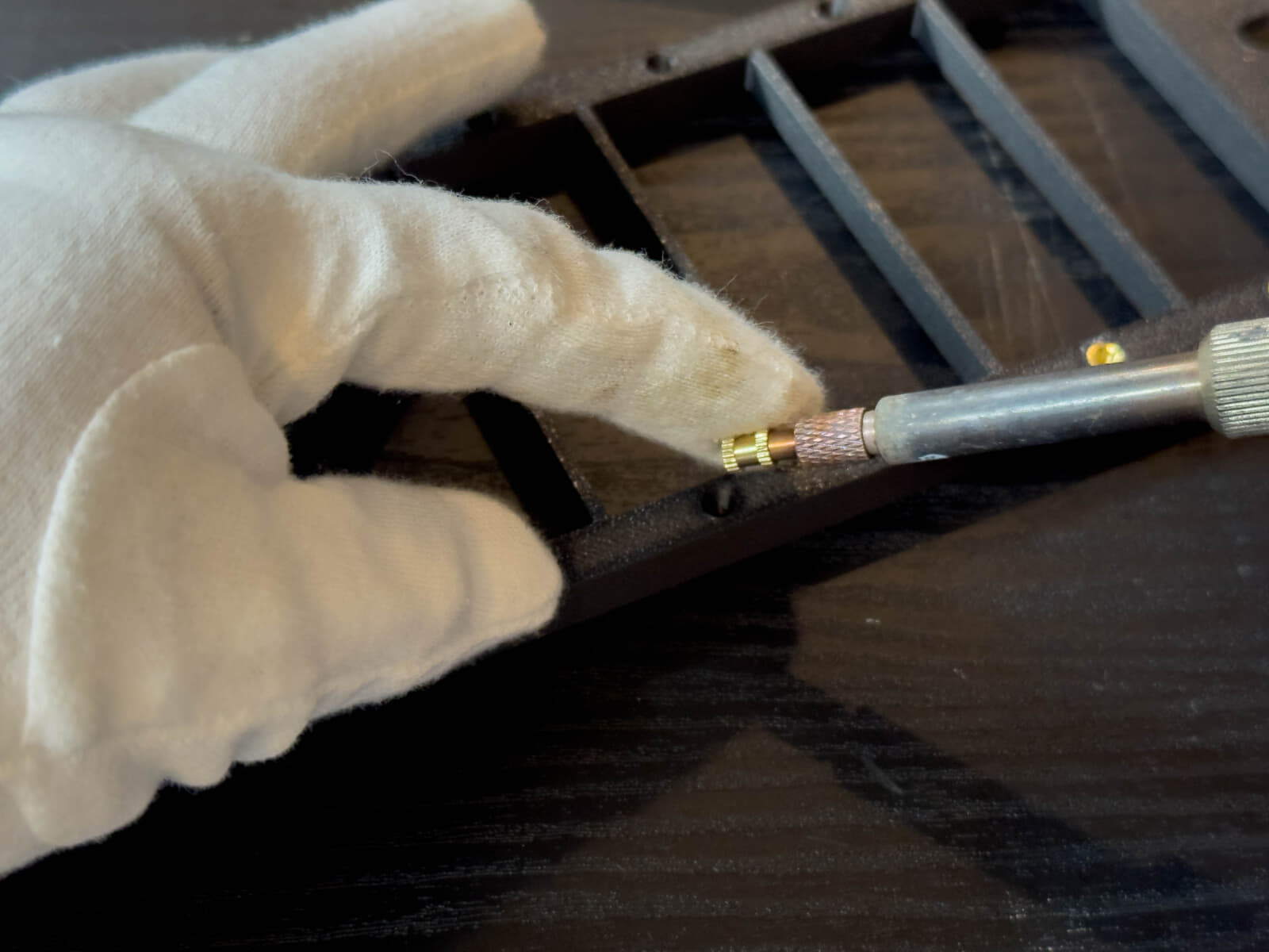 火傷しないよう綿手を2枚被せた上で、手でインサートナットがチップの先から落ちるのを抑えながら熱圧入したい場所に位置を合わせます。