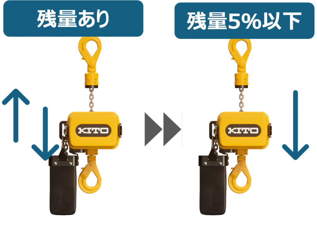 バッテリー残量が少なくなると自動的に昇降速度を制限し、巻上は停止、巻下げのみ可能になります。