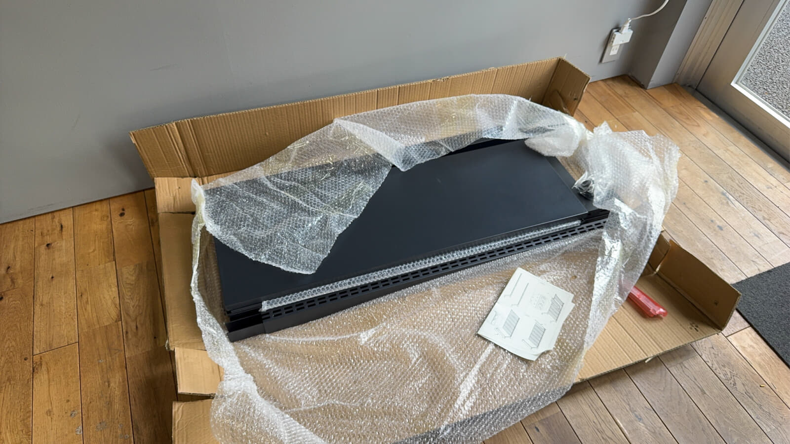 梱包箱を開封すると、こんな感じでコンパクトに収納されています。このサイズの箱に高さ2mの陳列ラックの部材が入っているのか少し不安でしたが、組み立ててみると製品説明どおりのサイズになりました。