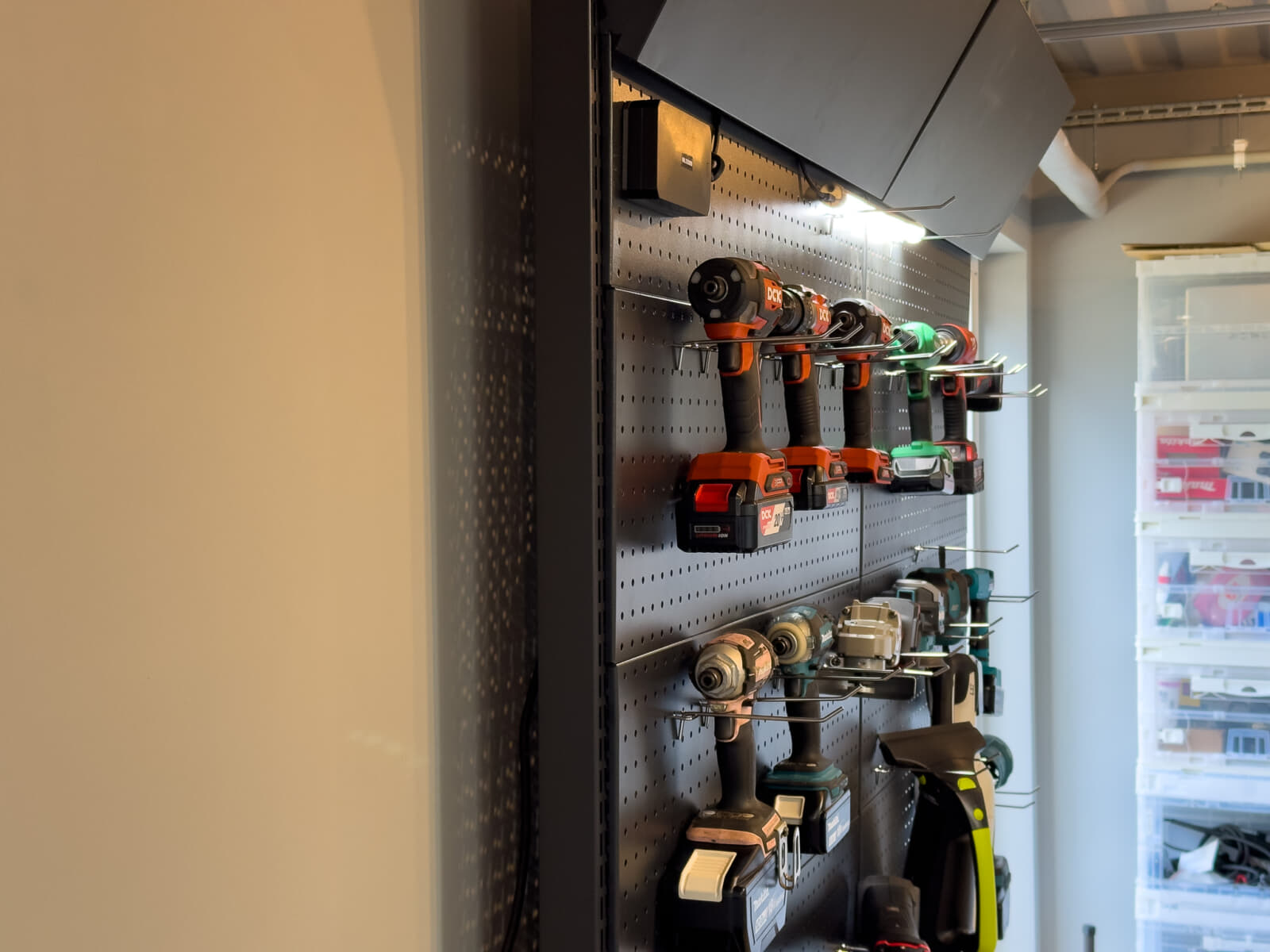 筆者は主に仕事場内で電動工具の使用が完結してしまうため、このようなラックで収納できるのは便利で気に入っています。見た目も綺麗に収納できるので、見てて楽しいのも良いポイントです。