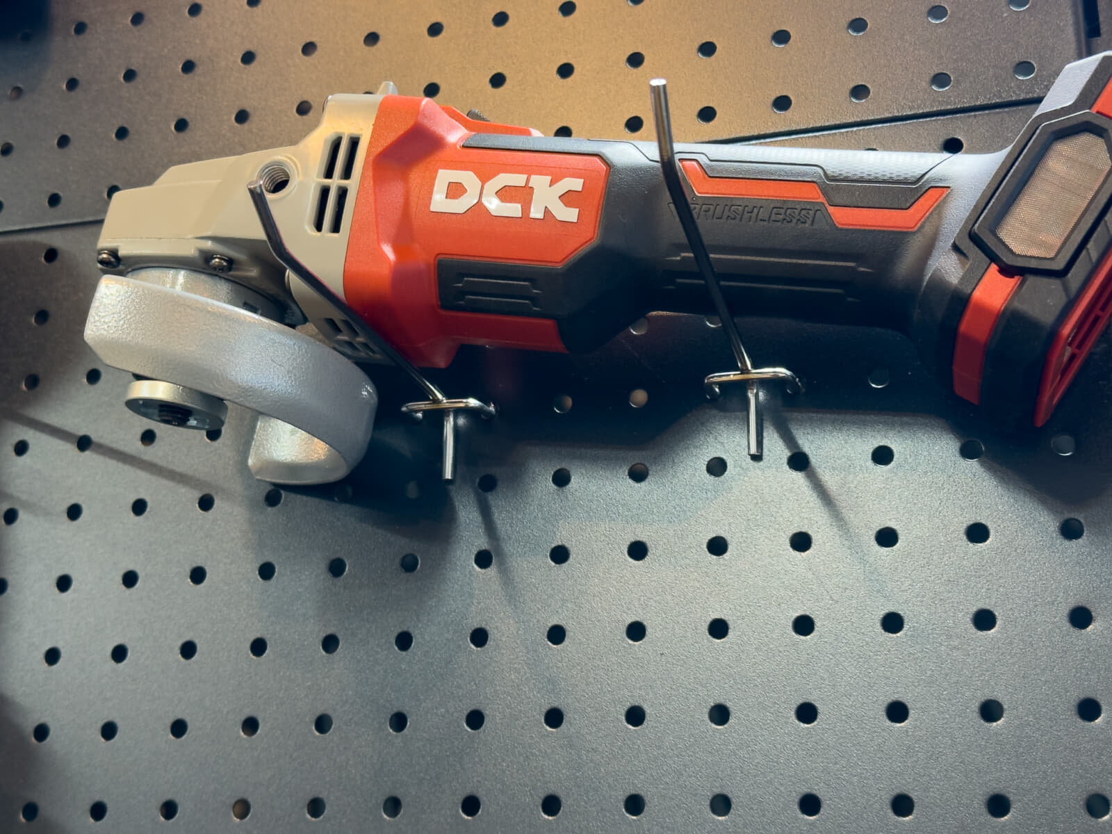ずんぐりとしたボディで重心が不安定なディスクグラインダも、フックだけで収めることができます。
