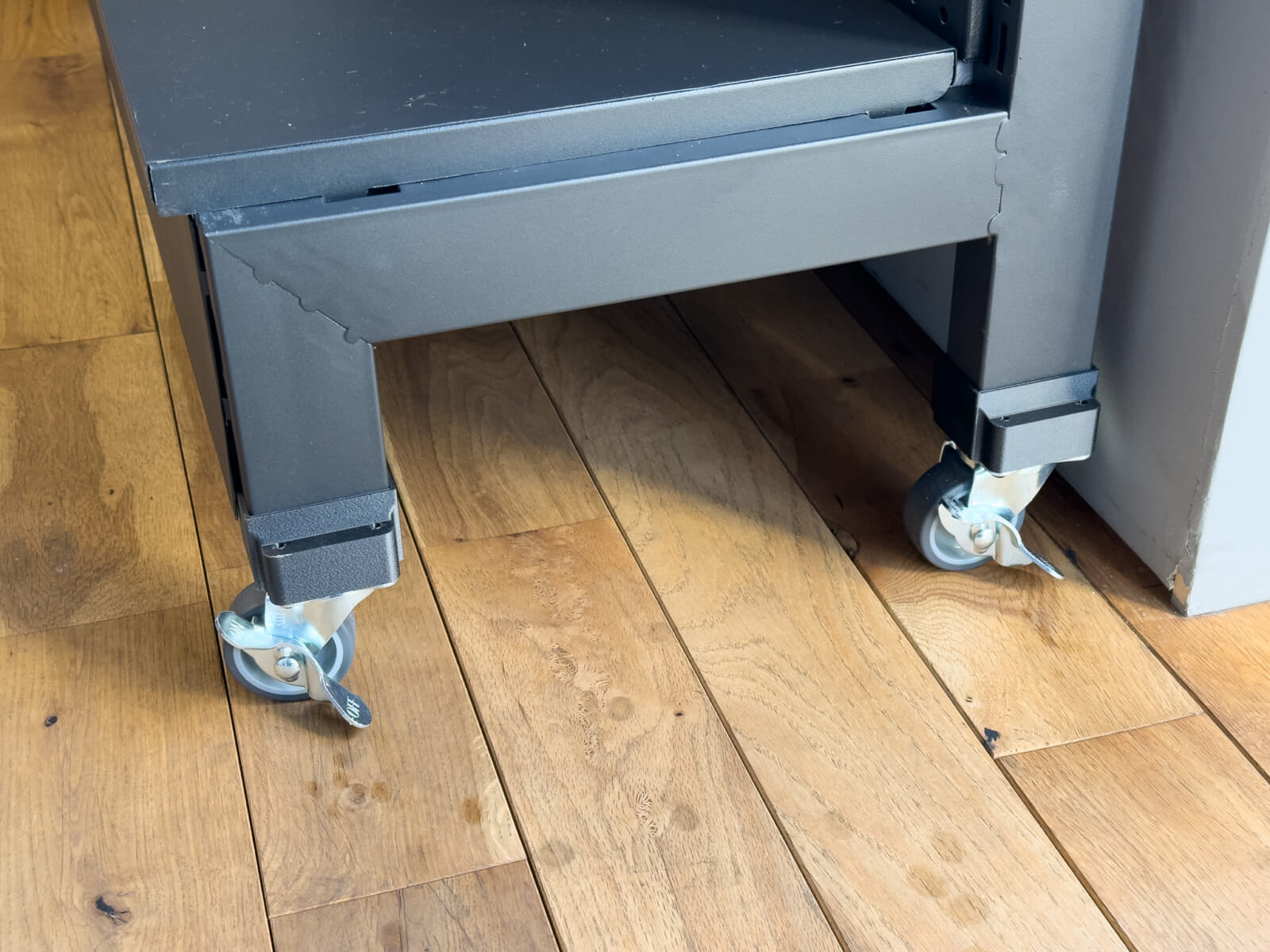 この陳列ラックは固定スタンド仕様なのですが、移動できるように3Dプリンタでキャスターを取り付けられるアタッチメントを作って使用しています。重心が後ろに寄ると倒れてしまうので注意が必要ですが、通常の設置状態では重心が前寄りになるため、倒れることもありません。