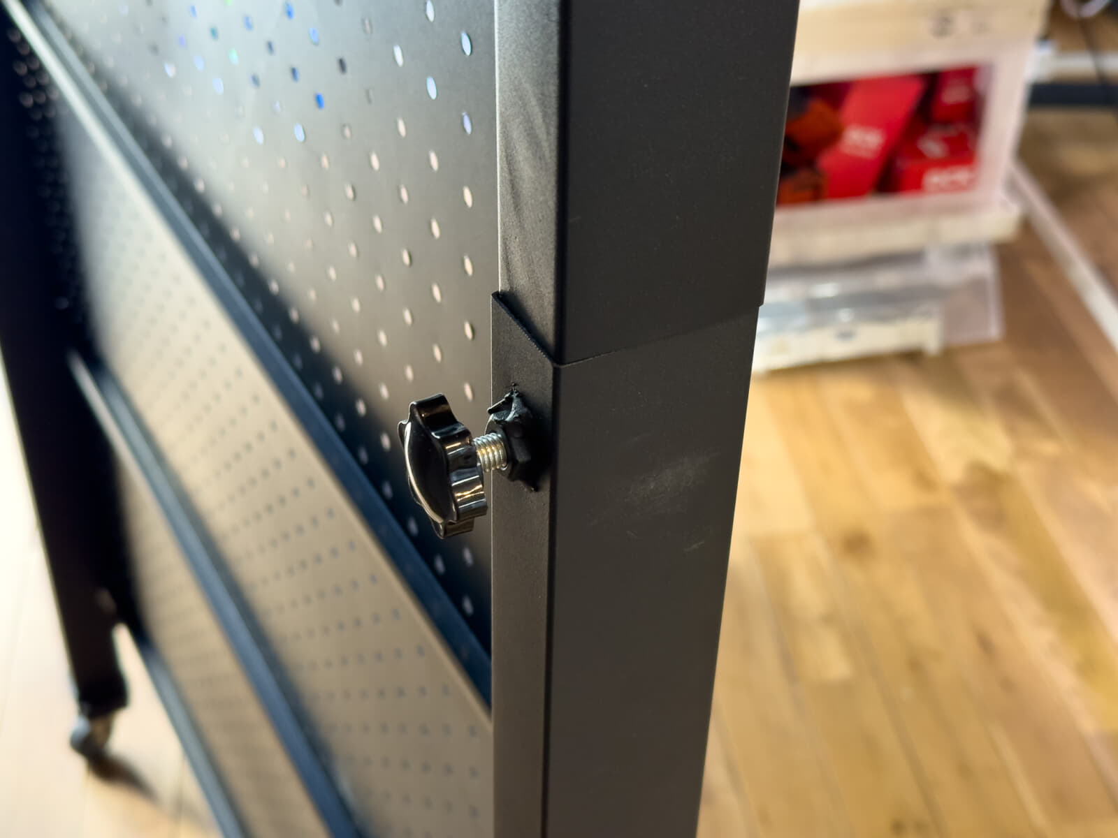 パンチングボードは、角パイプのレール穴に組み付けるだけで簡単に組み立てられます。ちなみにこのパンチングボードは板厚が薄く、簡単に曲がってしまうので注意が必要です。開封時点で爪が何本か曲がっていたため、曲げ直してから組み付ける必要があります。