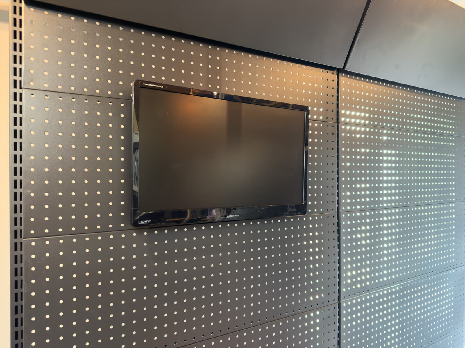 このパンチングボードは25mm間隔のΦ5mm穴が開いているので、市販のパンチングボード用アクセサリや、自作の取り付け器具も使用できます。筆者は3Dプリンタで100mm VESAマウントを有孔ボードに取り付けられるアタッチメントを作ってみました。