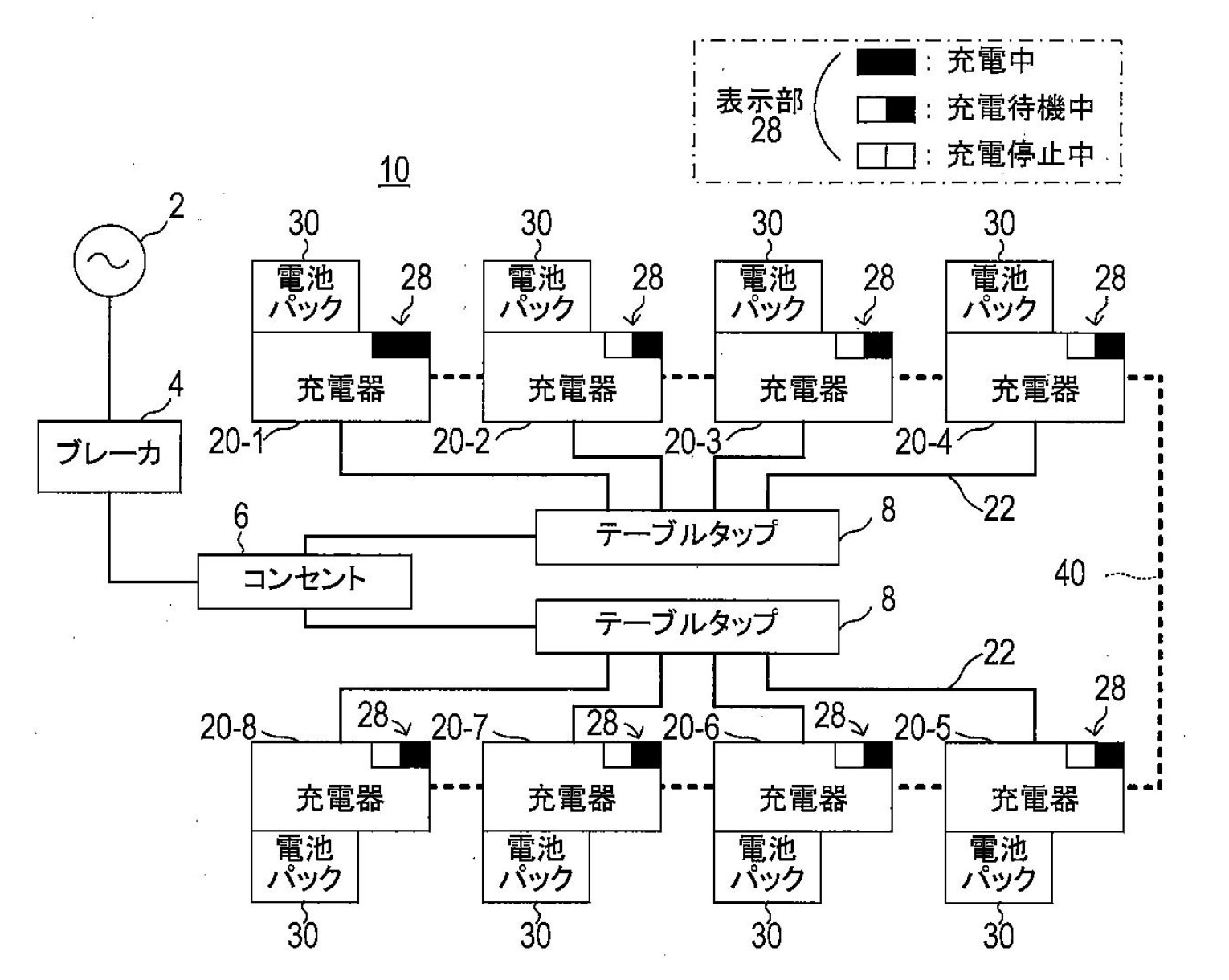 この特許は、マキタ充電器に通信線を追加して、充電器同士を数珠繋ぎ(デイジーチェーン)で通信できるようにすることで複数台数の充電器を稼働させた時のブレーカー落ちを防止するための機能です。