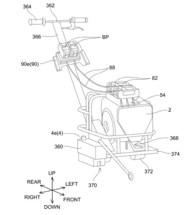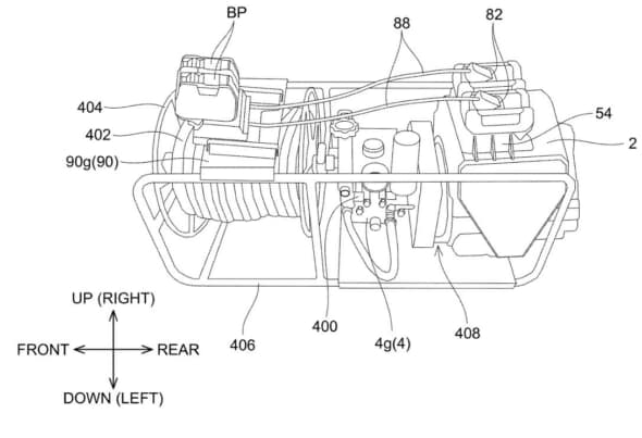 前回の特許内容では、パワーユニット本体にバッテリを直付する構造を意匠図として記載していましたが、今回の特許では、パワーユニットとバッテリを分離させて振動による影響を最小限に抑える新たな構造が記載されています。