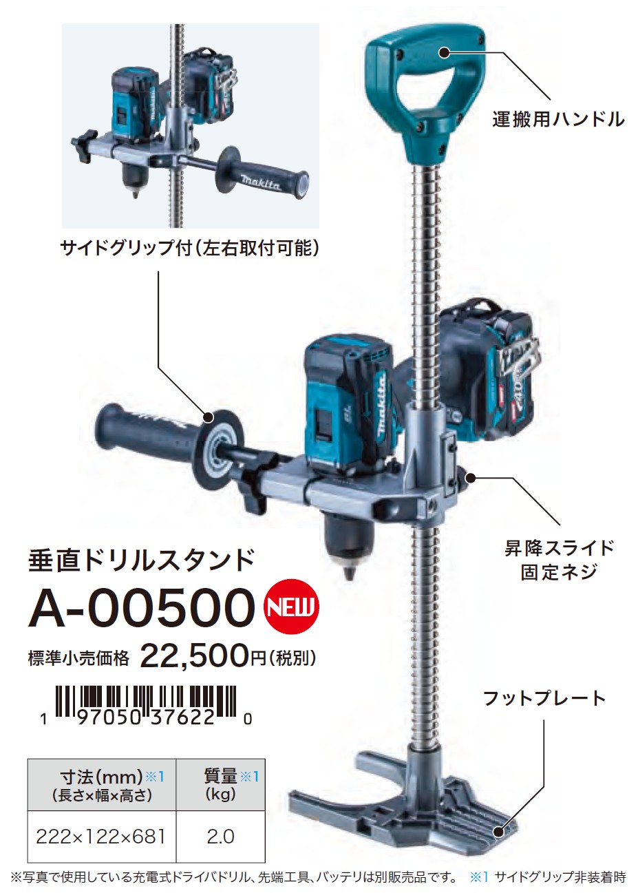 A-00500は、マキタの充電式ドライバドリルに装着する可搬式の垂直ドリルスタンドです。