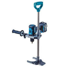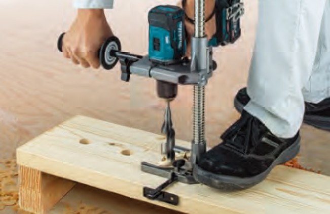 スタンドのベースを足で押さえつけて使用する構造になっているのが特徴で、可搬性に優れ木材への垂直穴あけを手軽にできるようになっています。最大対応ビット長400mm、最大ストローク375mmで、CLT材・LVL材用長尺ネジ締めの下穴あけ等にも最適です。