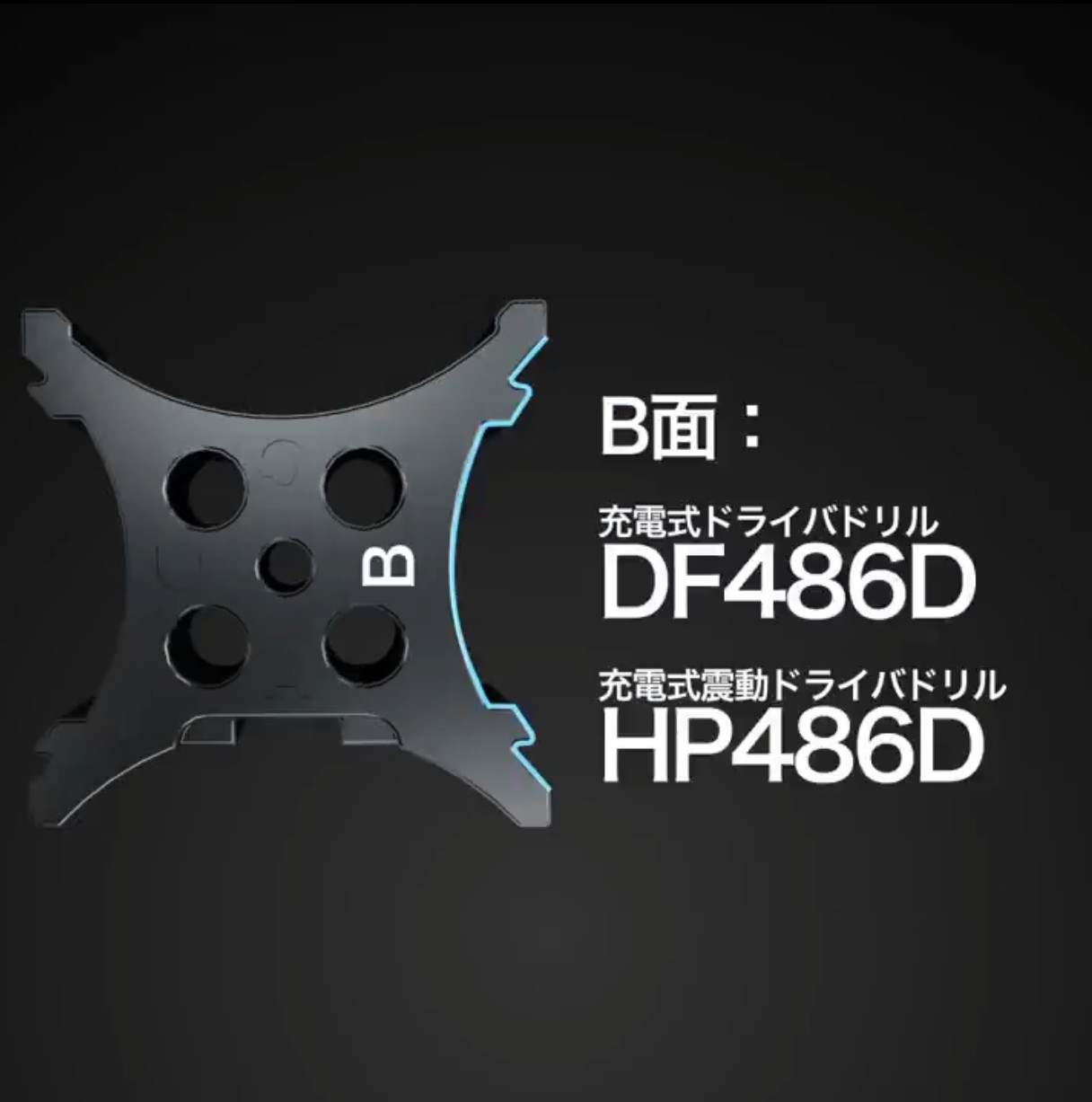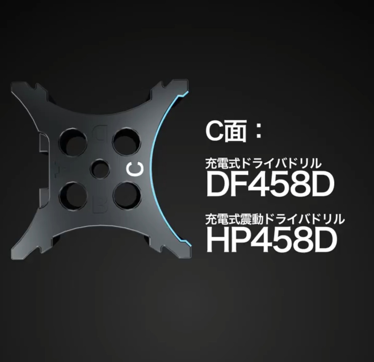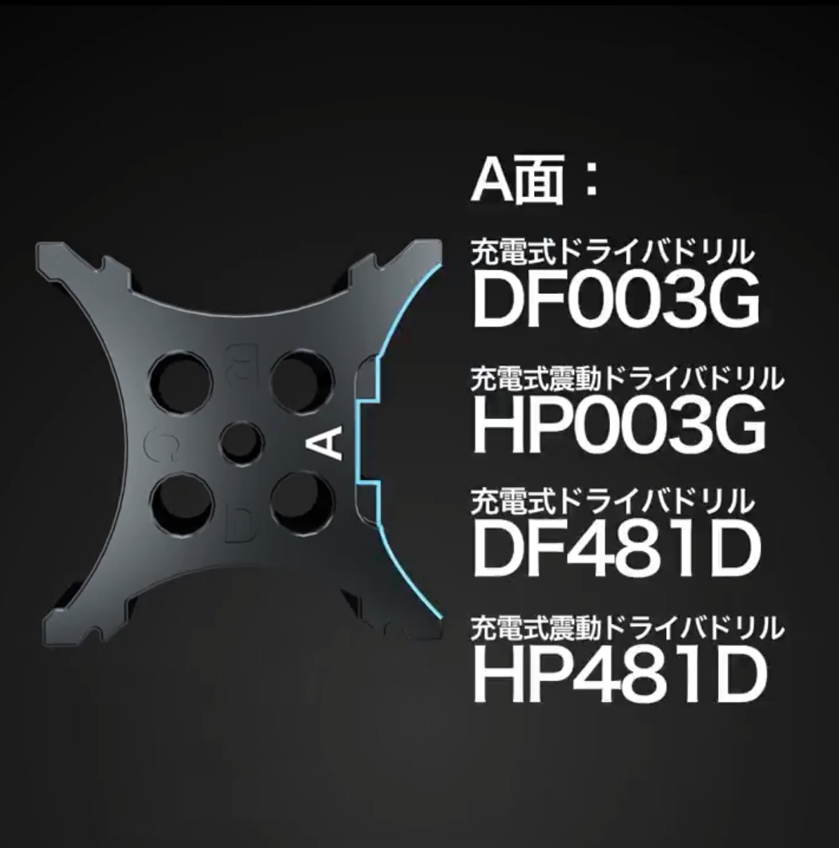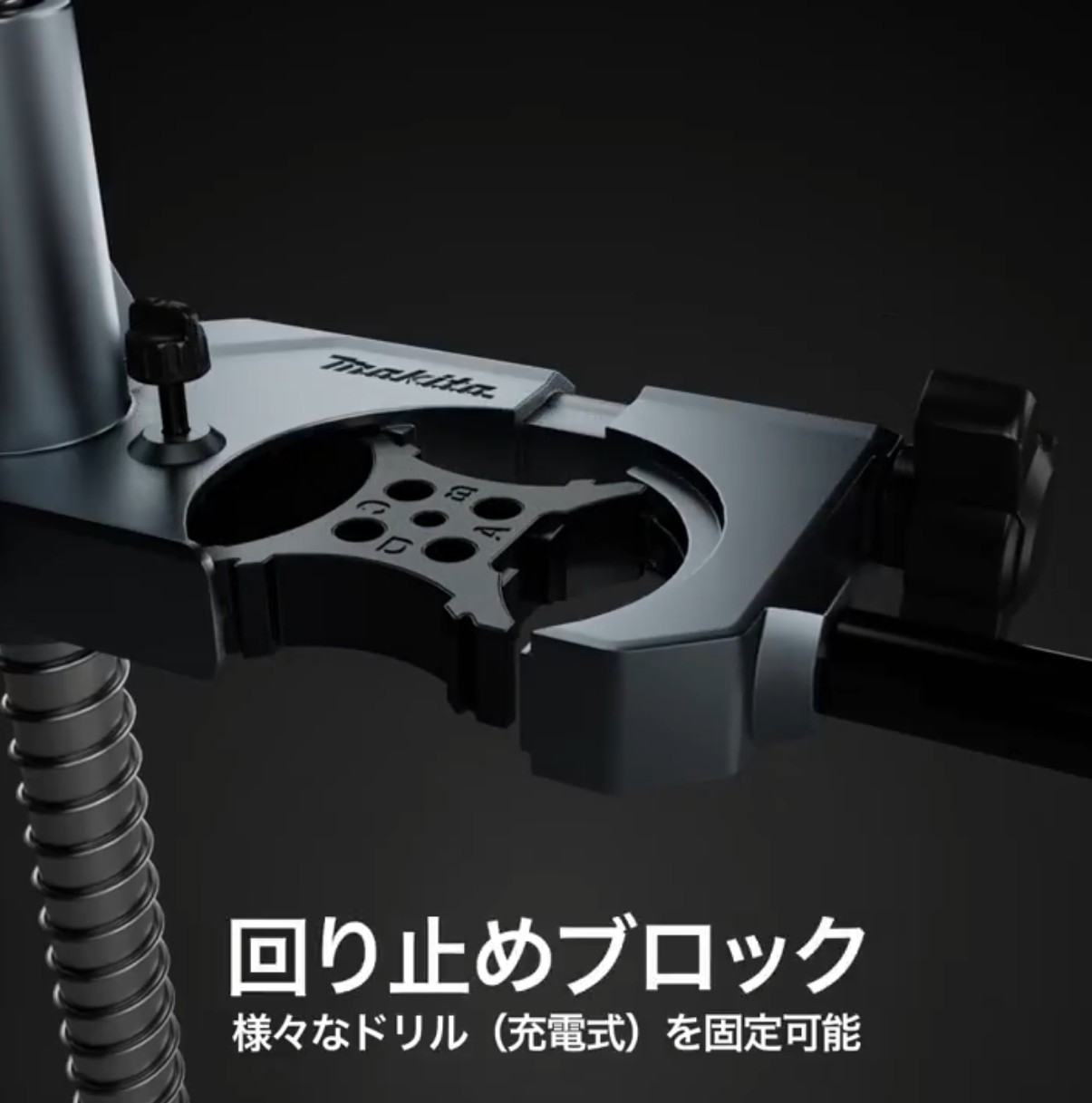 回り止めブロックの固定面を変えれば複数の充電式ドライバドリルに対応