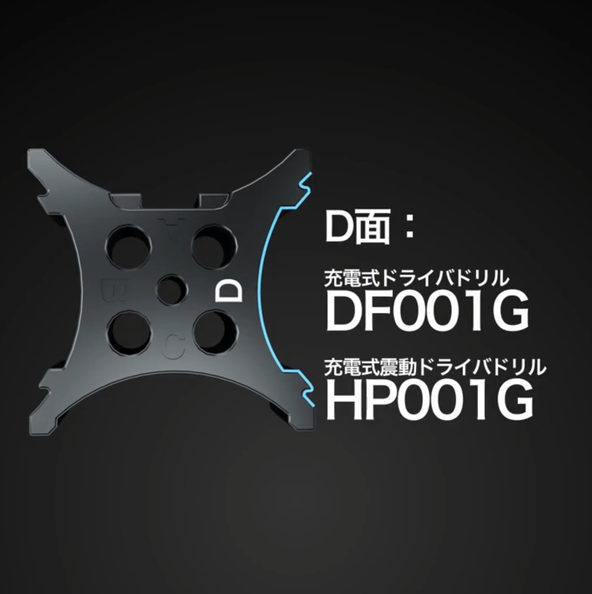 充電式ドライバドリルの固定は回り止めブロックで固定する構造になっており、対応製品に応じたブロックを固定位置に納めることでさまざまなモデルの充電式ドライバドリル/震動ドライバドリルの固定に対応します