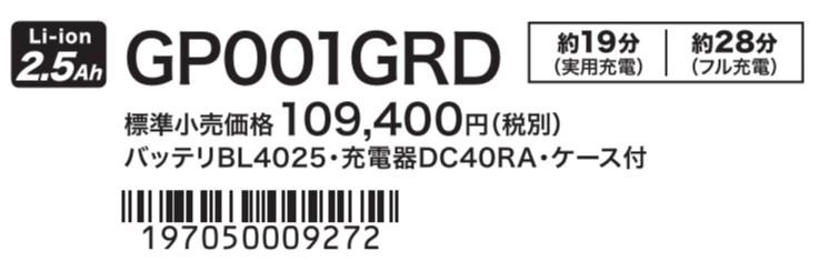 - GP001GRD バッテリ充電器ケース付属 希望小売価格109,400円(税抜)