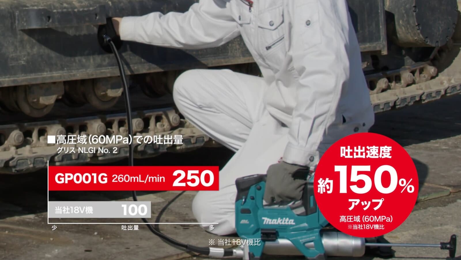 40Vmaxバッテリ対応によって高圧時にも安定したグリス吐出を実現しており、高圧域 (60MPa)での吐出速度は18VモデルのGP180D比で約150%向上しているのが特徴です。
