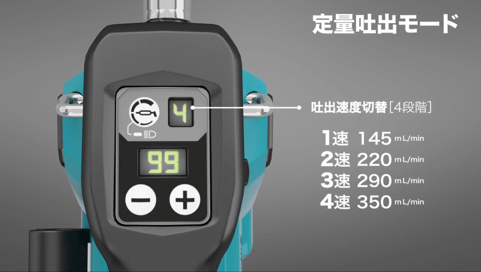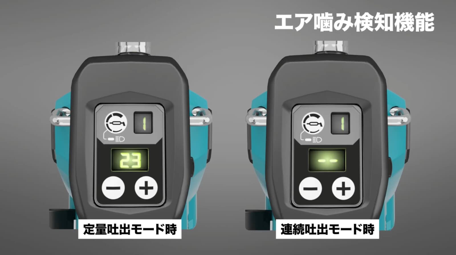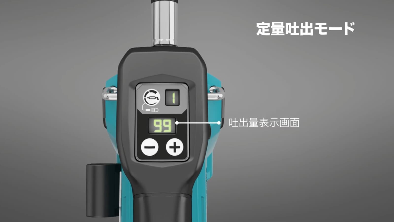 新モードとして定量吐出モードを備え、指定の設定値でグリスを吐出する機能によってトリガ操作だけで素早く簡単にグリスアップ作業を完了できる機能も搭載しました。