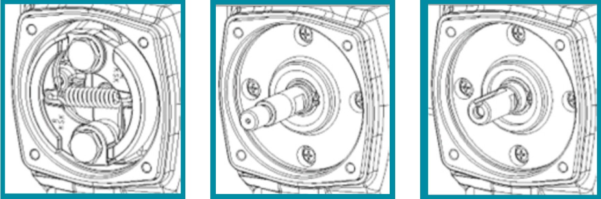 出力軸の仕様は形状選択が可能で「クラッチ」「スピンドル(ネジ)」「スピンドル(キー)」の3種類に対応します。