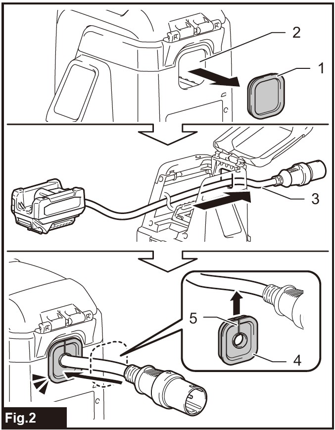 バッテリ装着部の裏面は通し穴が開けられており、PDC1200のアダプタセットのケーブルが通せる構造になっています。PDC1200の装着により定格1kW出力時でも連続1時間を超える連続運転が可能と想定されます。