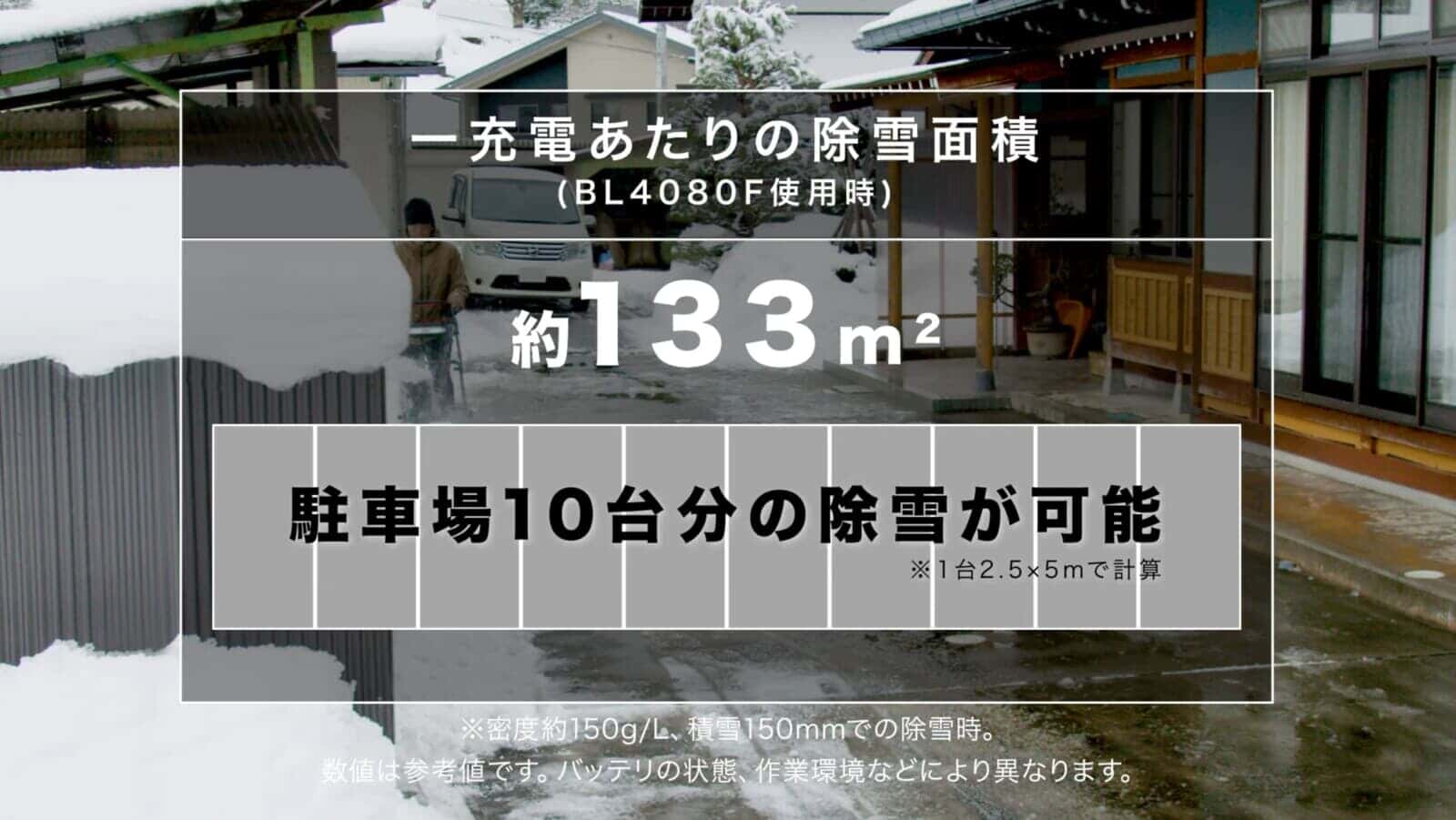 1充電当たりの除雪面積はBL4080F装着時で約133m2に対応しており、駐車場約9~10台分の除雪作業が可能です。