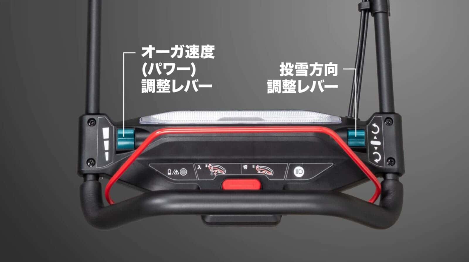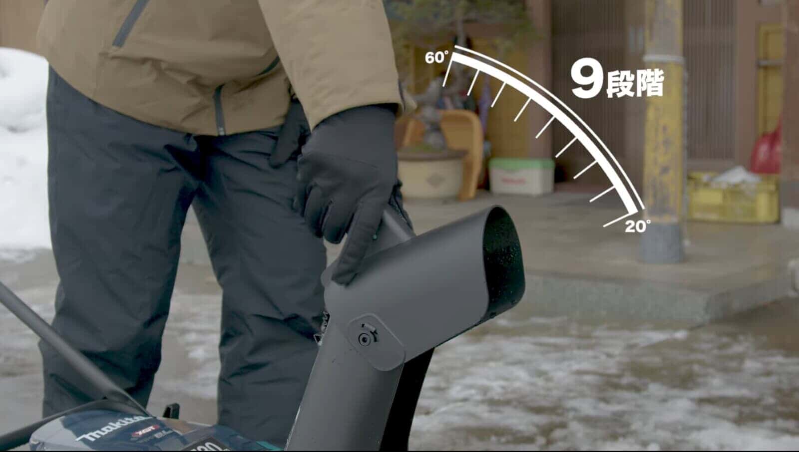 投雪は任意の場所へ飛ばせる構造を備えており、左右方向180度は電動式で手元の操作部から調整が可能で、投雪角度は手動で9段階の調節が可能です。