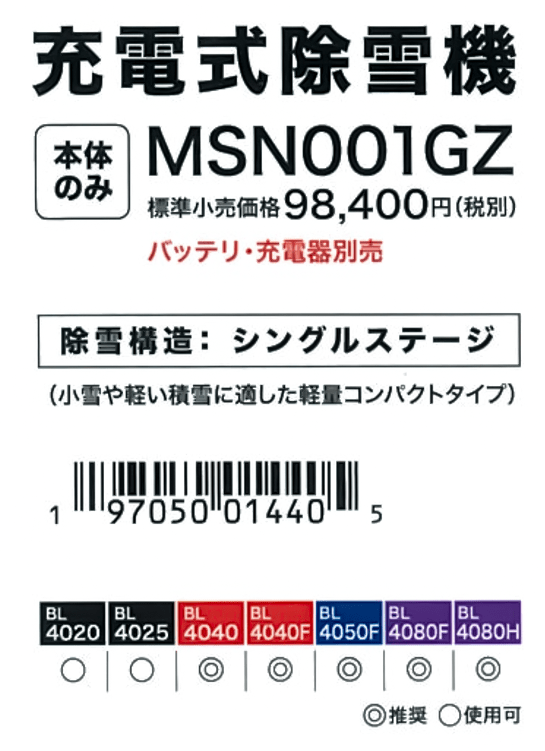 MSN001Gは、マキタ40Vmaxシリーズ初の充電式除雪機です。