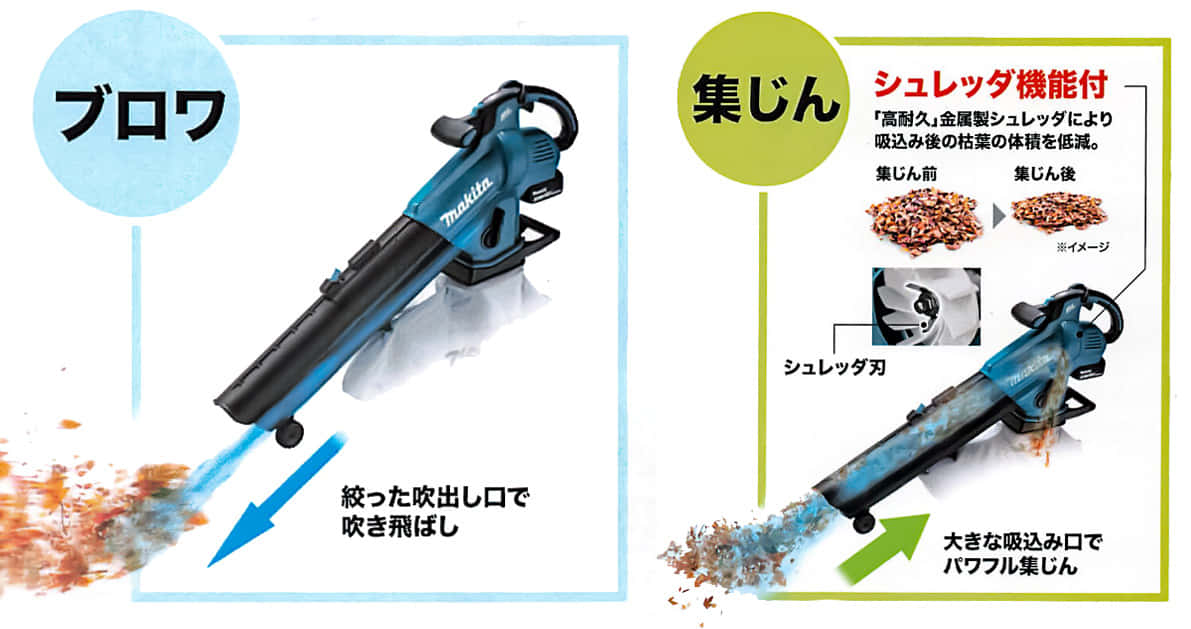 MUB187Dはブロワ動作に加えて集じん動作も可能なブロワバキュームです。これまでの18Vクラスの屋外清掃機器は、送風のみのブロワ製品がほとんどでしたが、集じん動作も可能になったことで、落ち葉の吹き集めと回収が1つの園芸機器で済むようになりました。