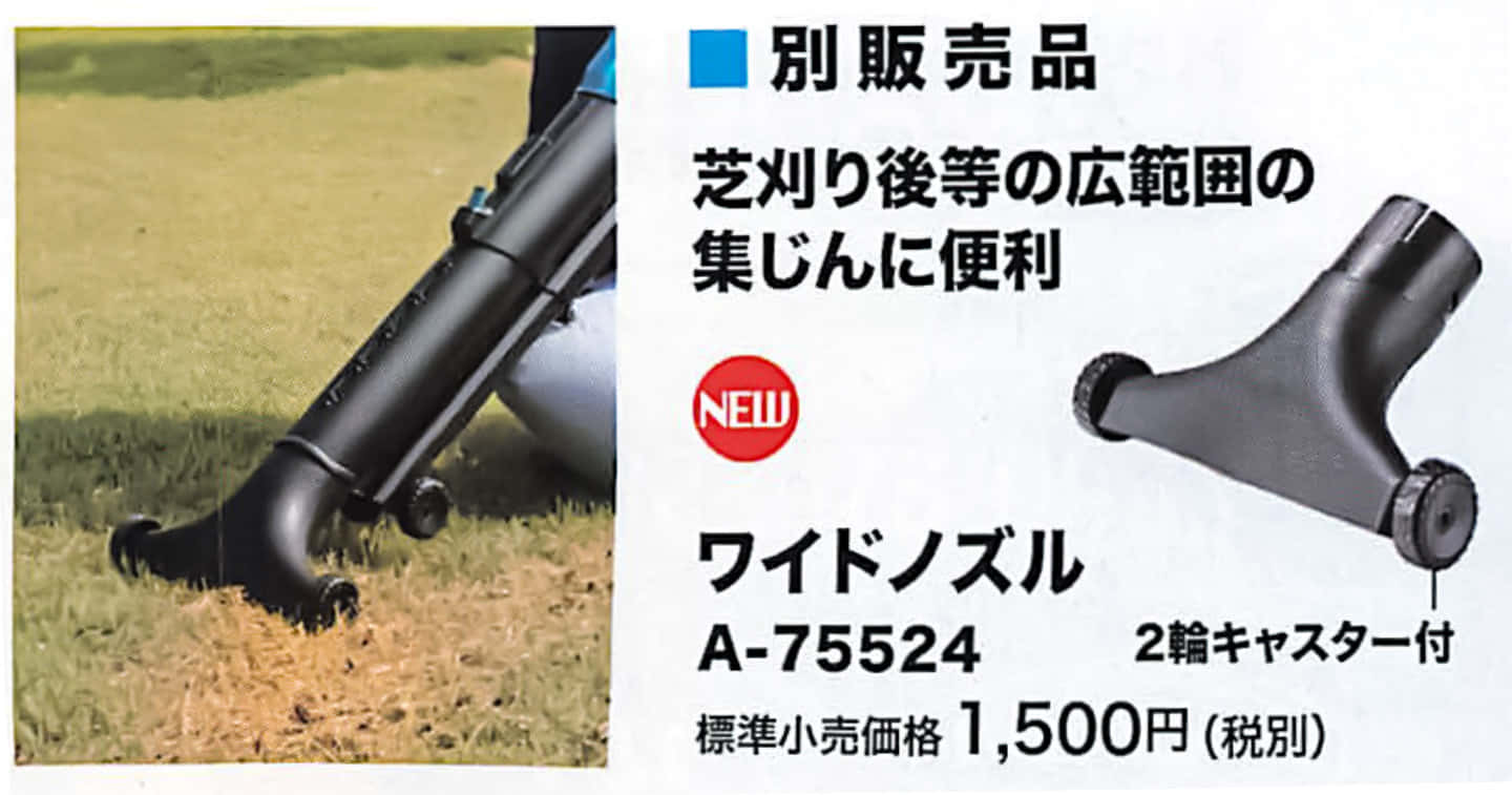 別売のワイドノズル(A-75524)の装着で芝刈り後の広範囲集じんにも対応します。