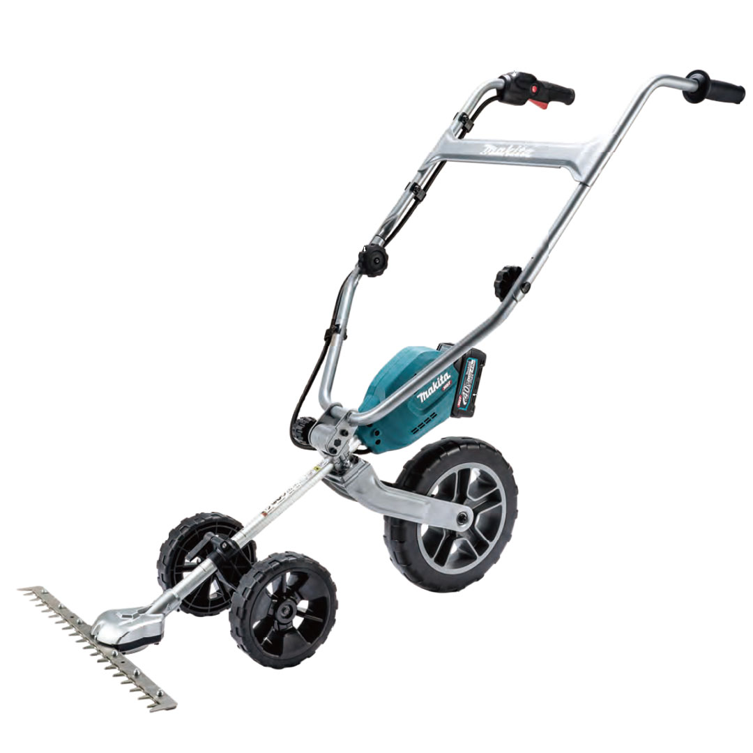 前輪Φ180mmのタイヤ2本と後輪Φ300mmの3輪タイヤによって土の上でもスムーズな走行が可能になり、高耐久の拝み刃仕様の500mm幅ヘッジトリマで石飛を抑えつつ効率的な草刈り作業を実現します。