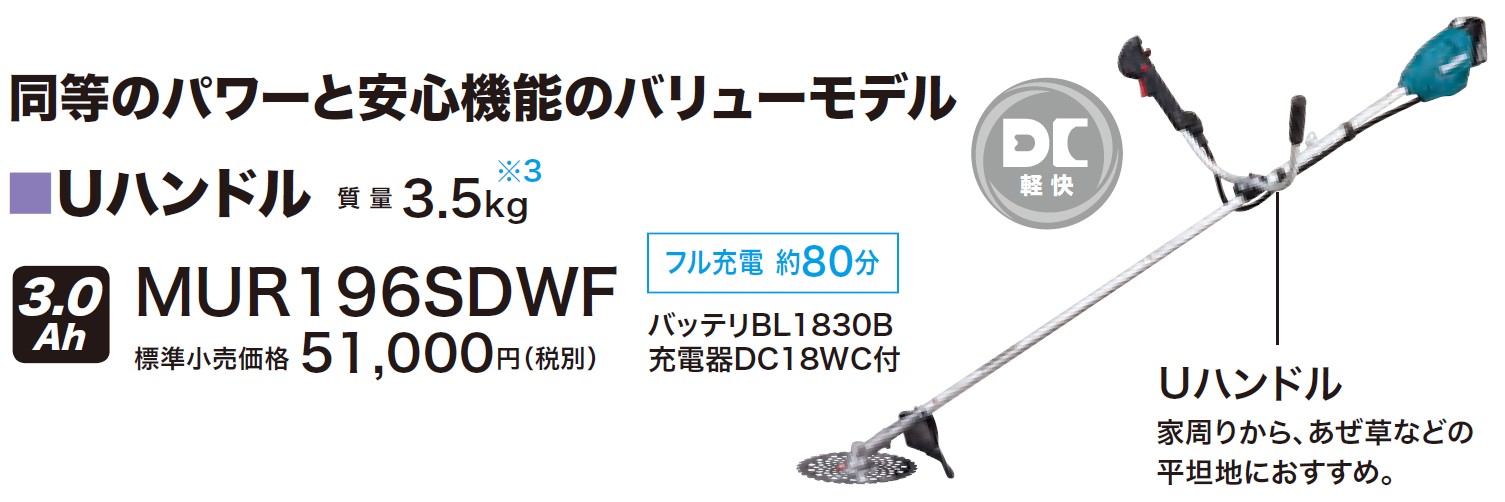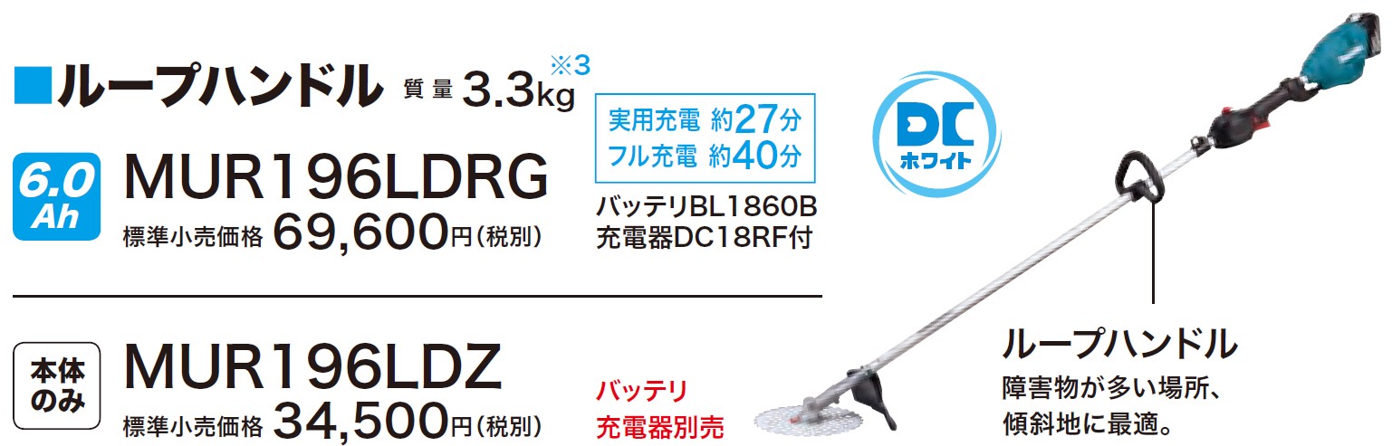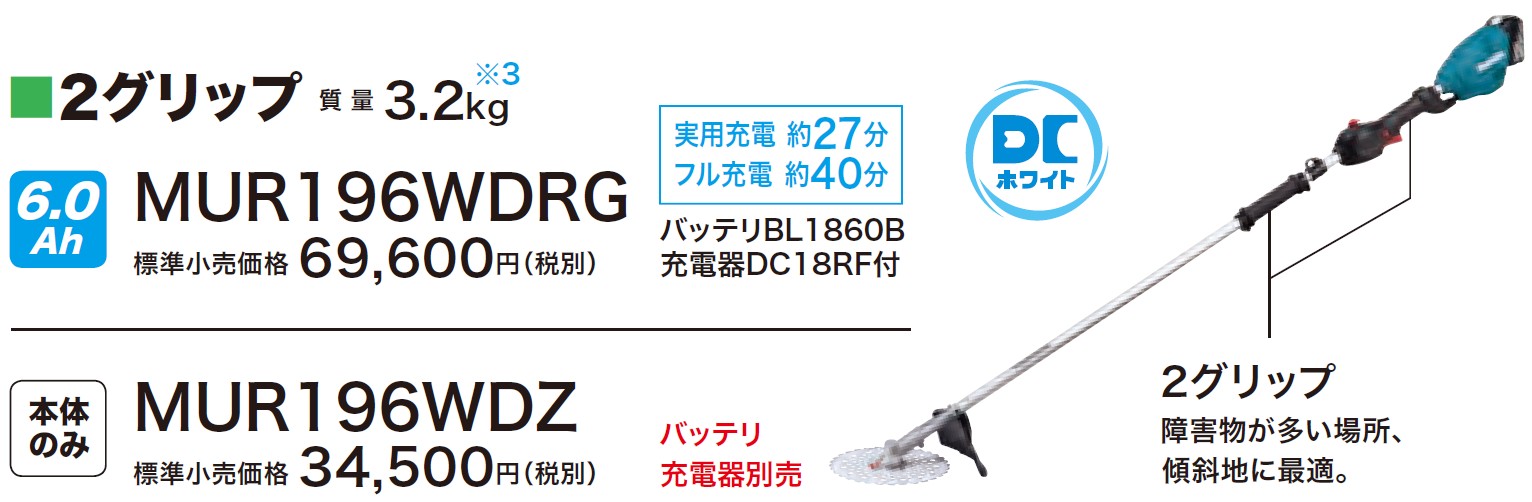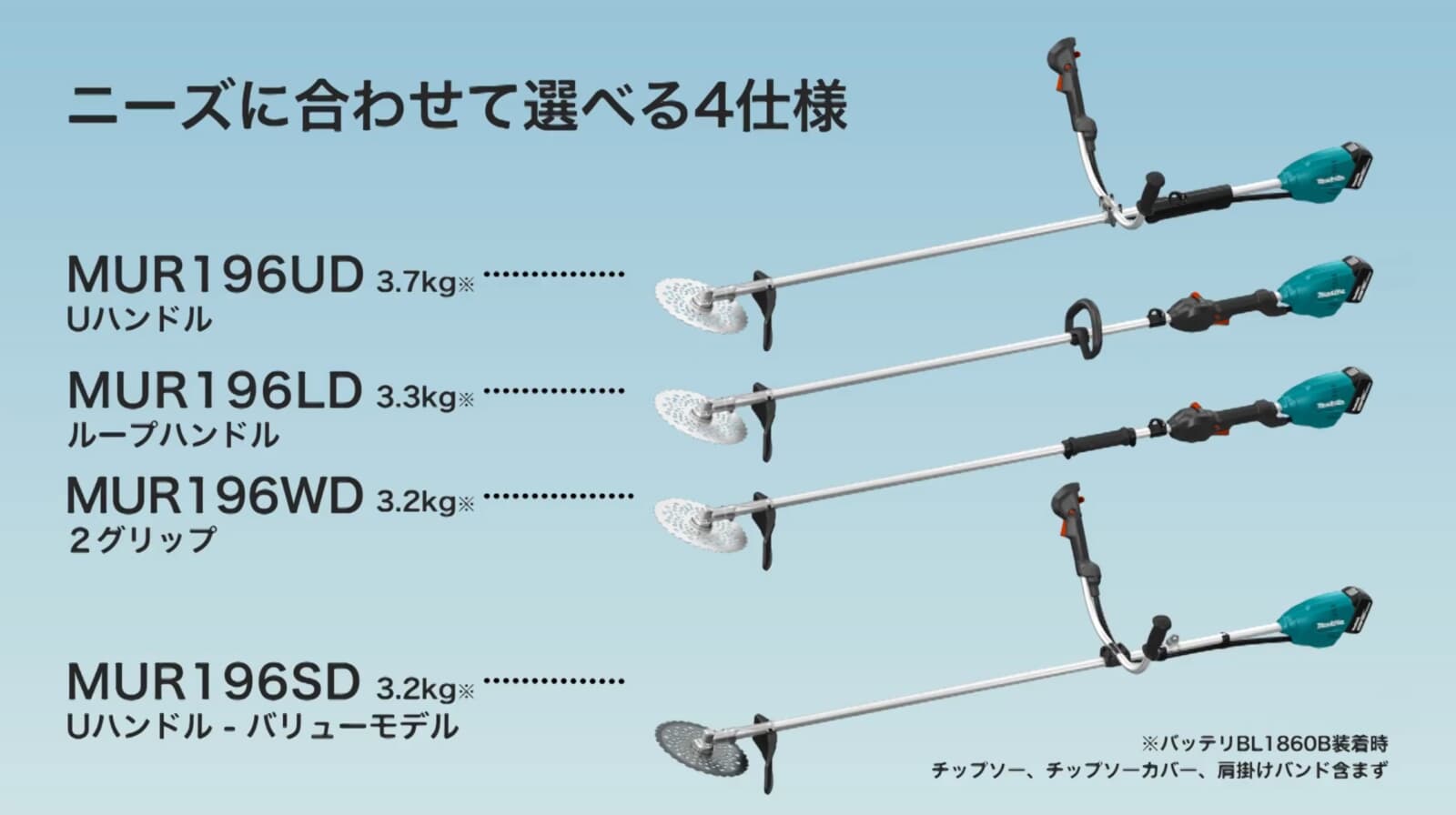 販売仕様はハンドル形状が異なる仕様として、Uハンドル仕様 MUR196UD、ループハンドル仕様 MUR196LD、2グリップ仕様MUR196WDの3仕様を展開します。販売仕様は、充電器バッテリーが付属するDRGと本体のみのDZで販売します。