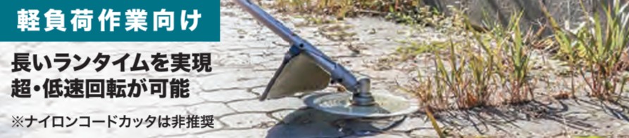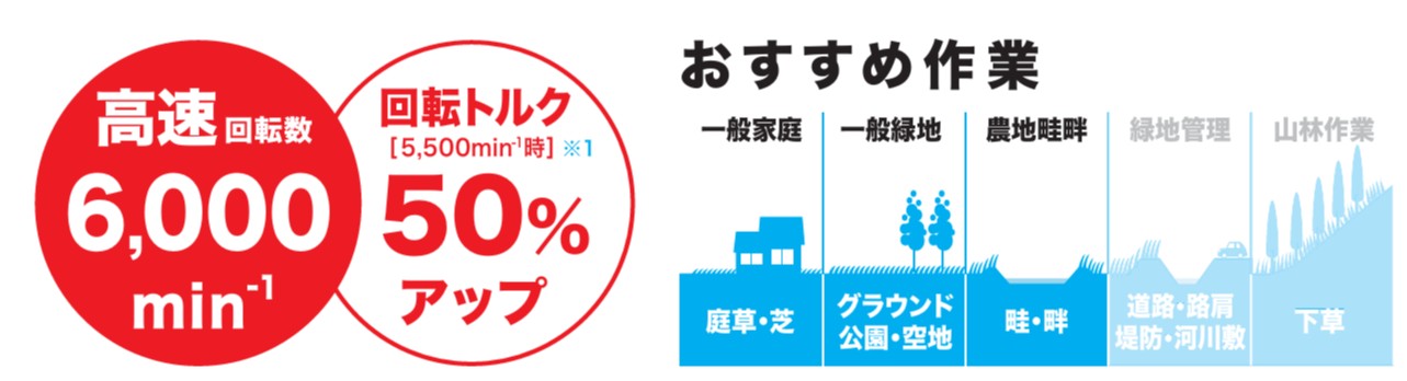 先端回転数6,000min-1仕様を備え、回転トルクは従来モデル比較で50%アップしているのが特徴で、一般家庭での庭草・芝の刈払い作業から農地の畦・畔などの刈込作業など幅広い用途に対応します。