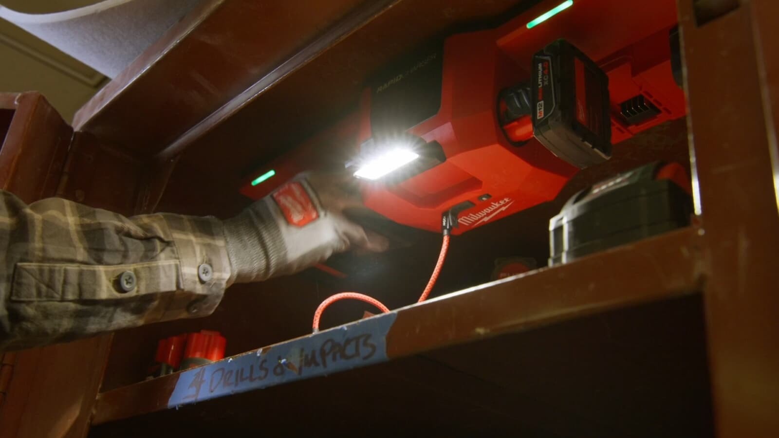 M12-18MCは、そうした弱点を補うために、マグネットや壁掛けフックを標準装備した充電器と考えられます。さらにUSBポートを2基備え、LEDライトまで搭載している点も特徴で、単なる電動工具用充電器というよりも現場や工場の資材置き場で使う「充電スポット」のようなコンセプトの元開発されたのかもしれません。